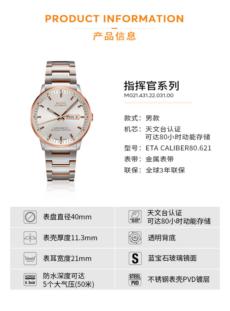 商品名称:MIDO美度 指挥官天文台认证机械男表 (不支持无理由退换货)