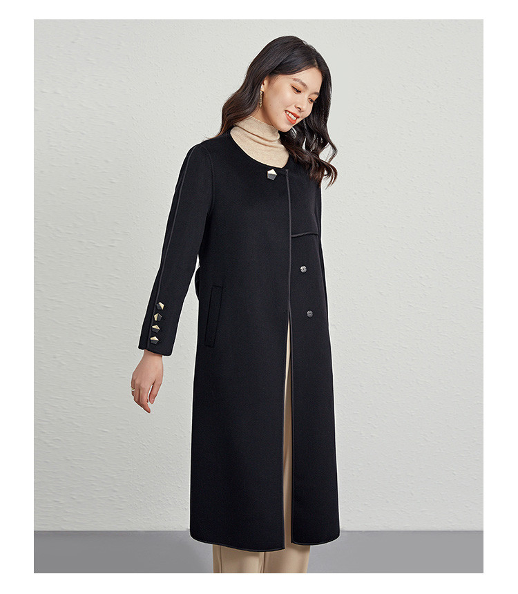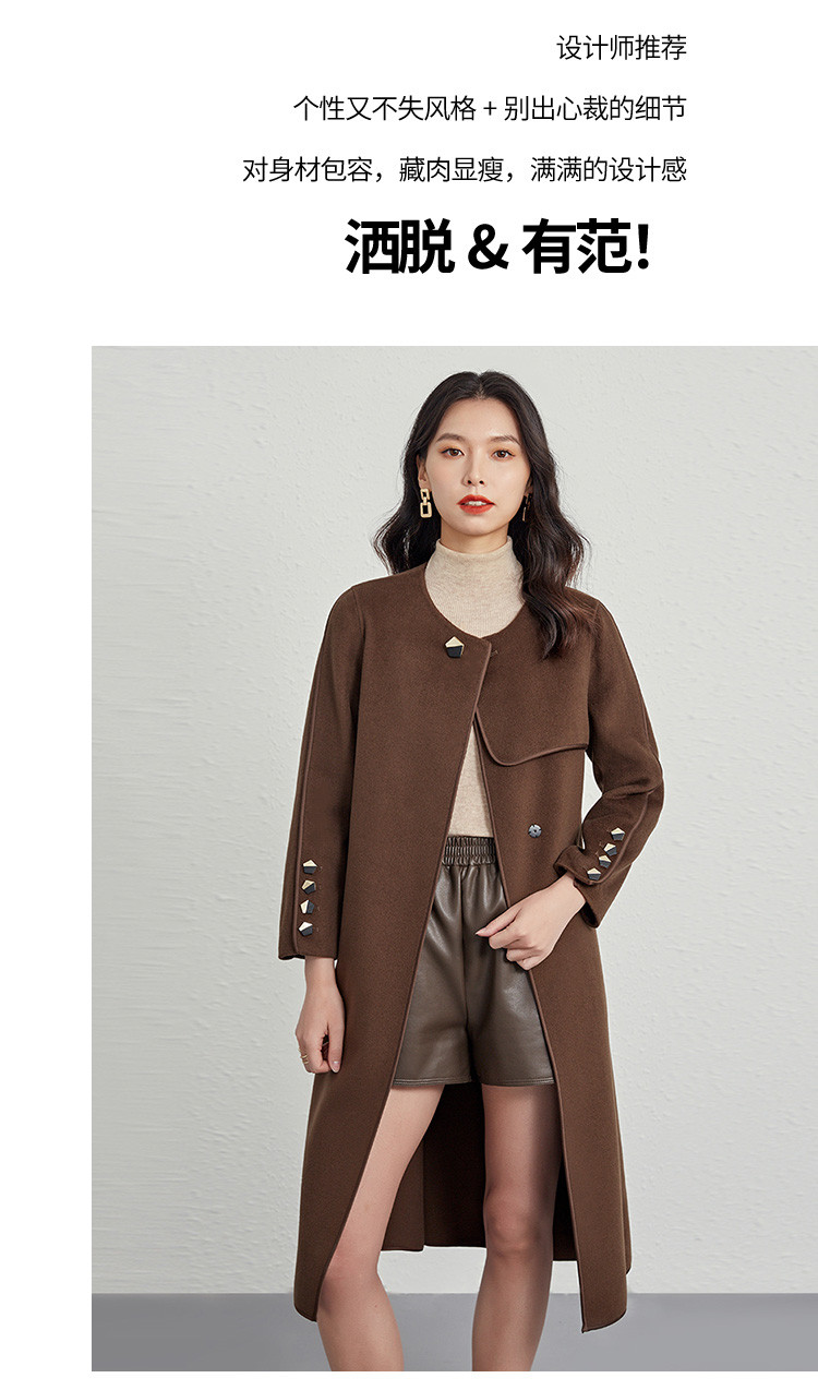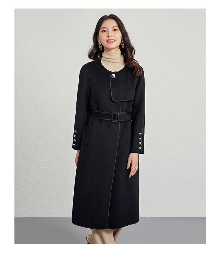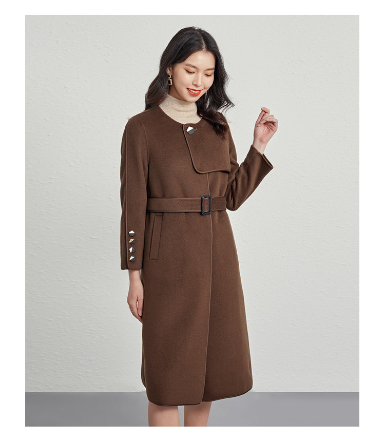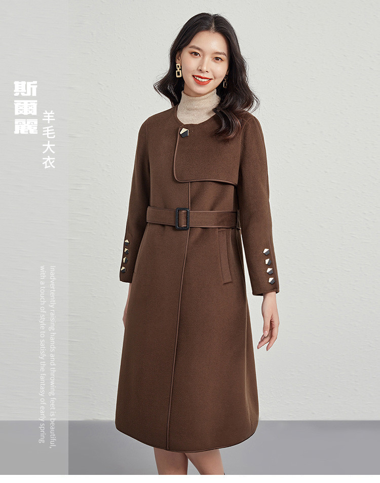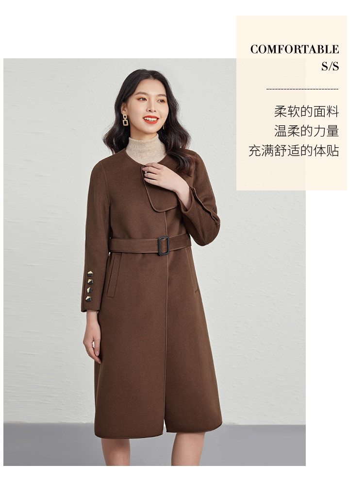 秋冬时尚设计感羊毛大衣女式休闲圆领不对称长款双面呢外套 547935