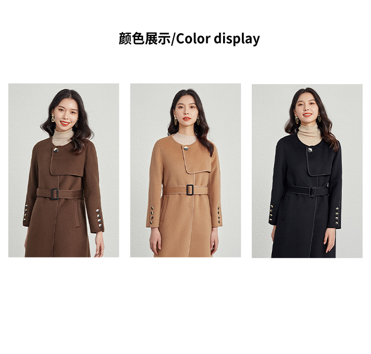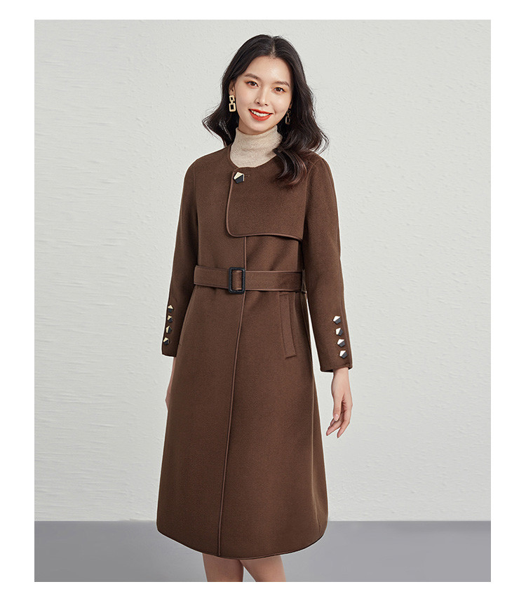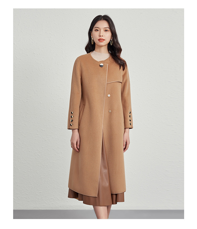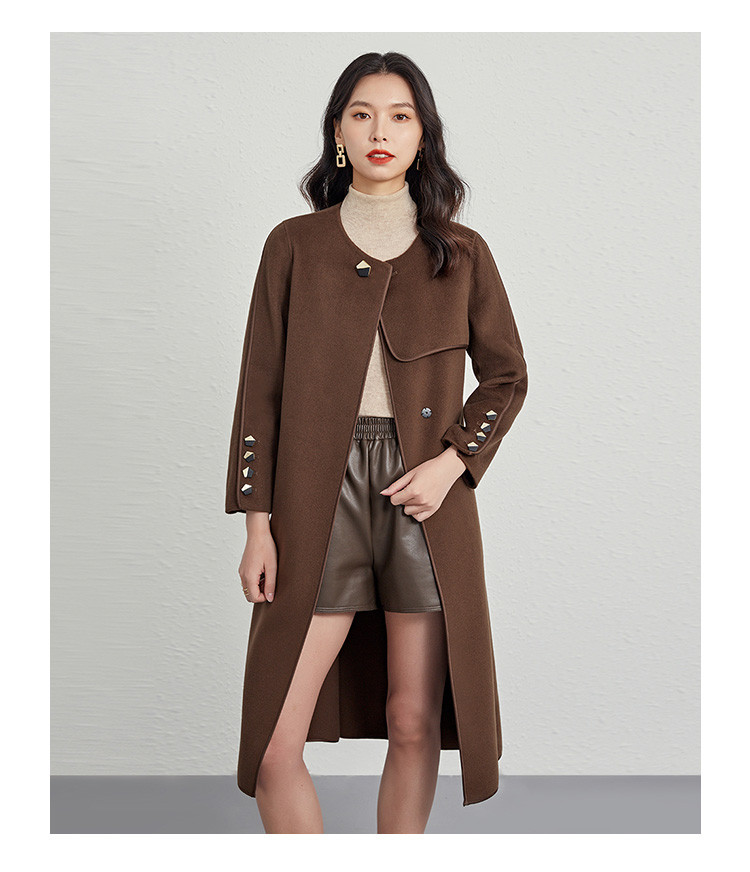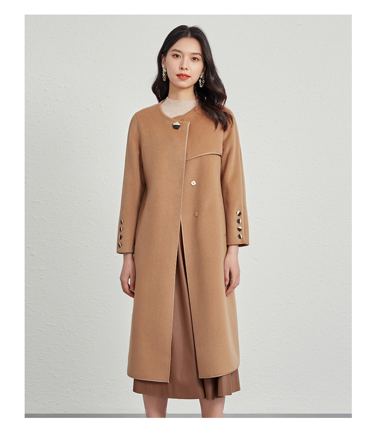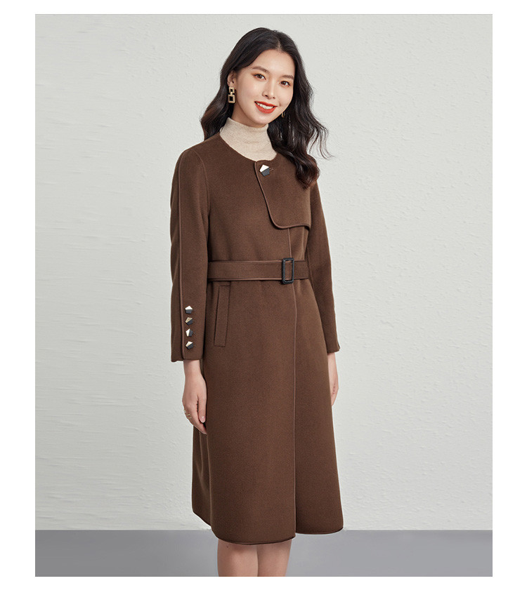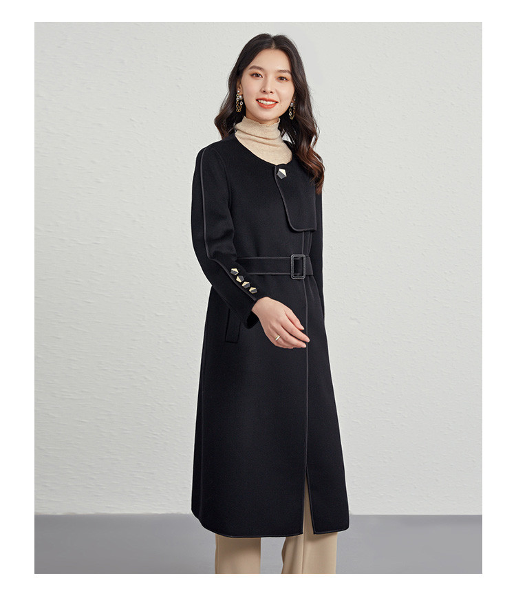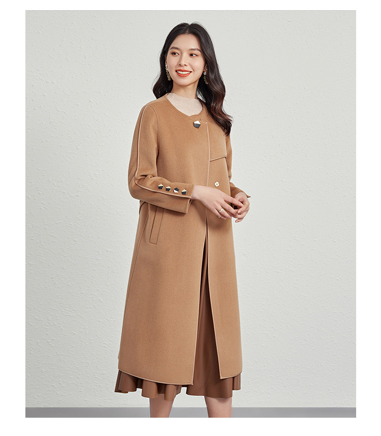 秋冬时尚设计感羊毛大衣女式休闲圆领不对称长款双面呢外套 547935