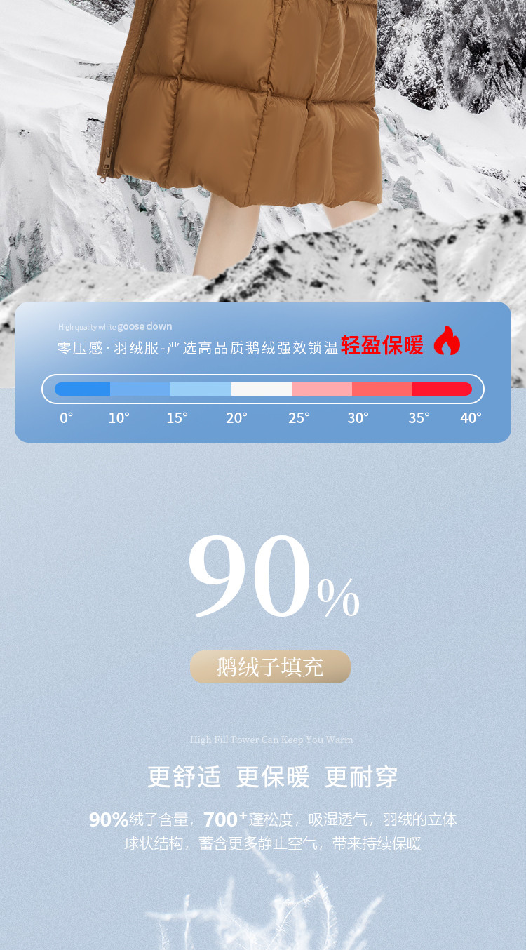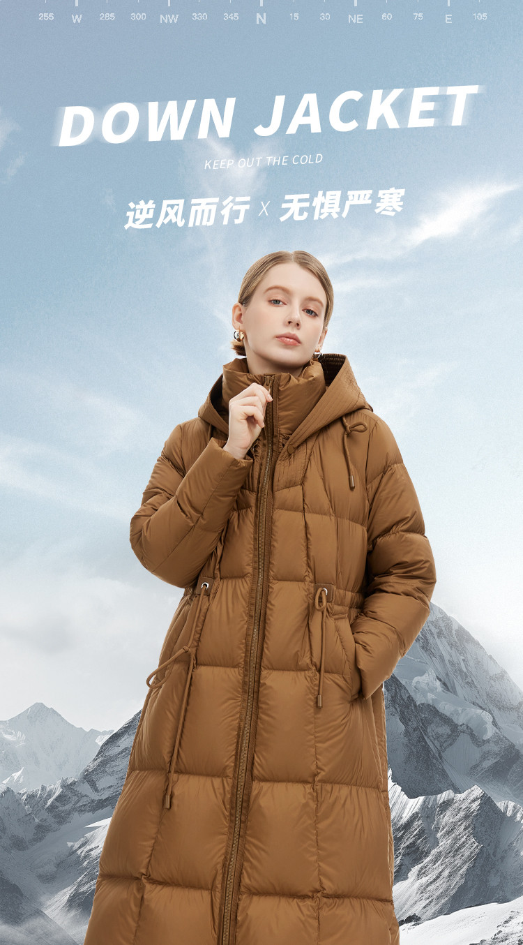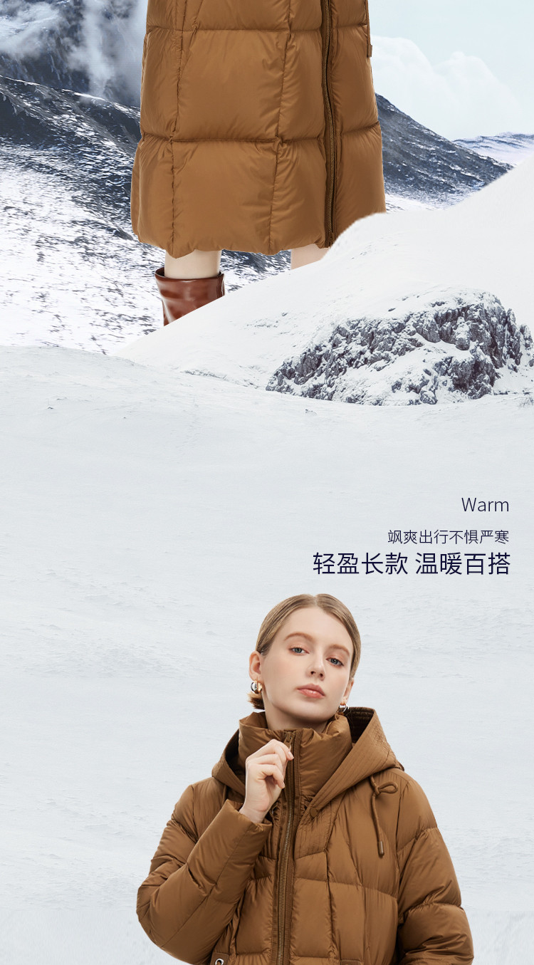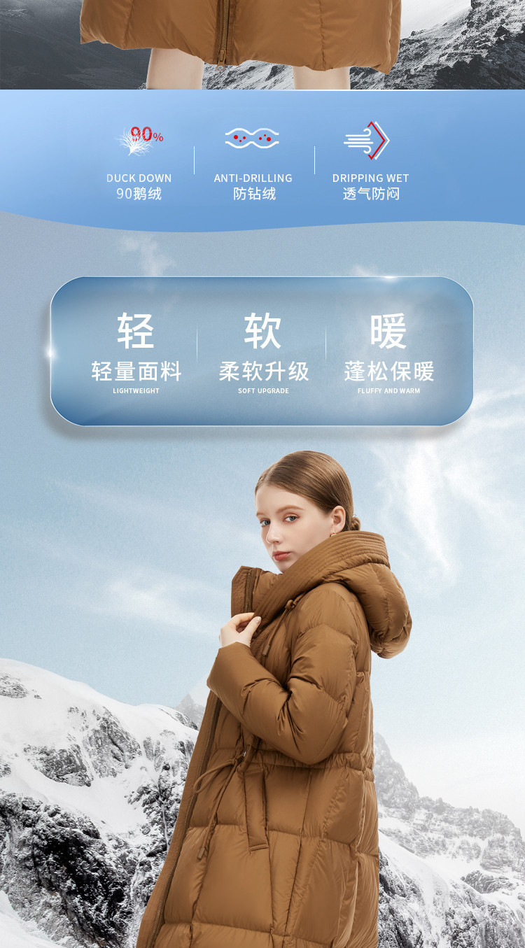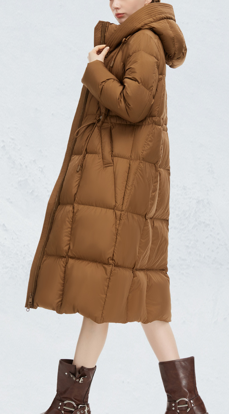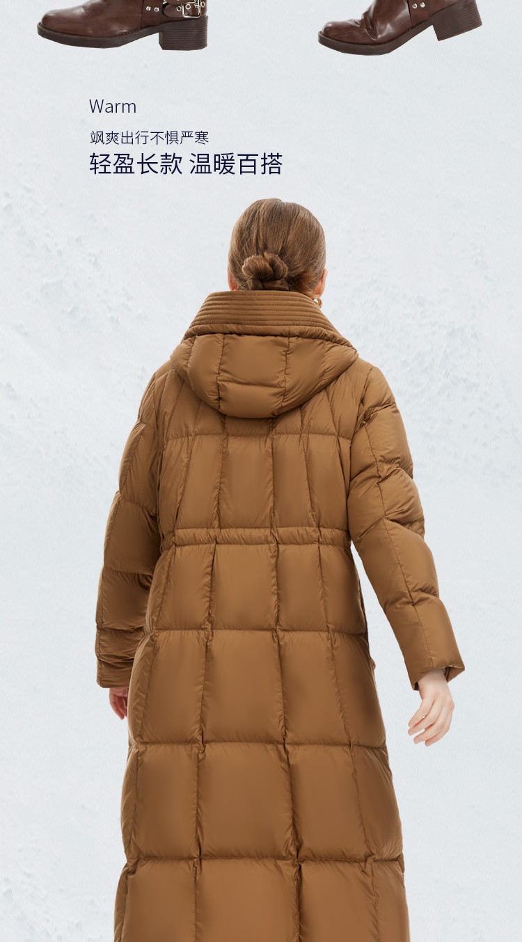 【鹅绒】气质商务风腰绳收腰女式连帽保暖长款羽绒服 629215
