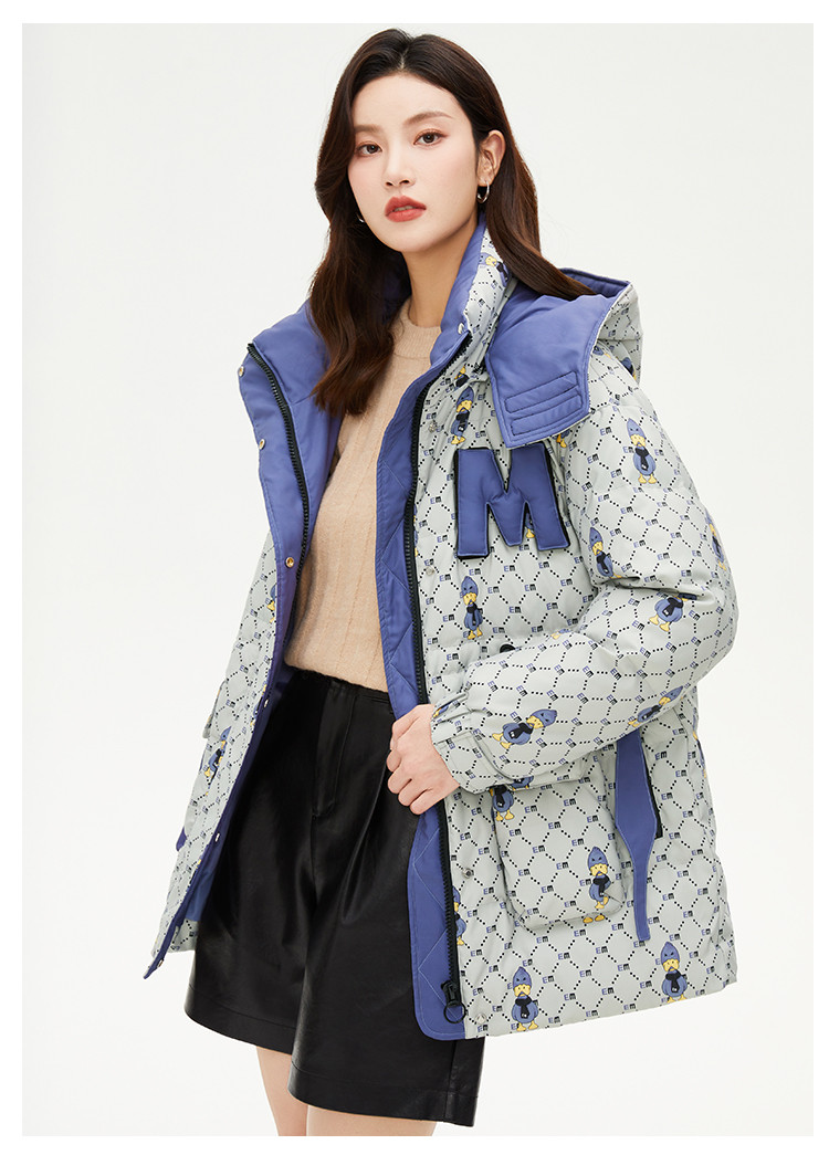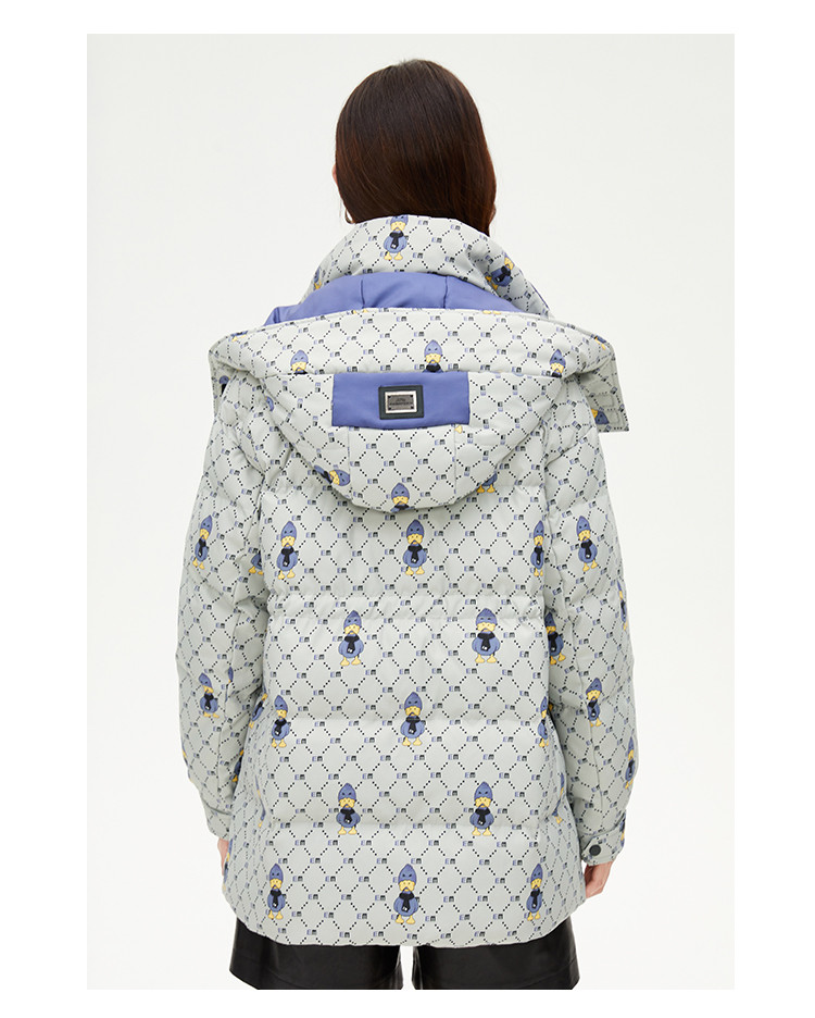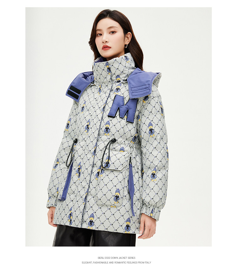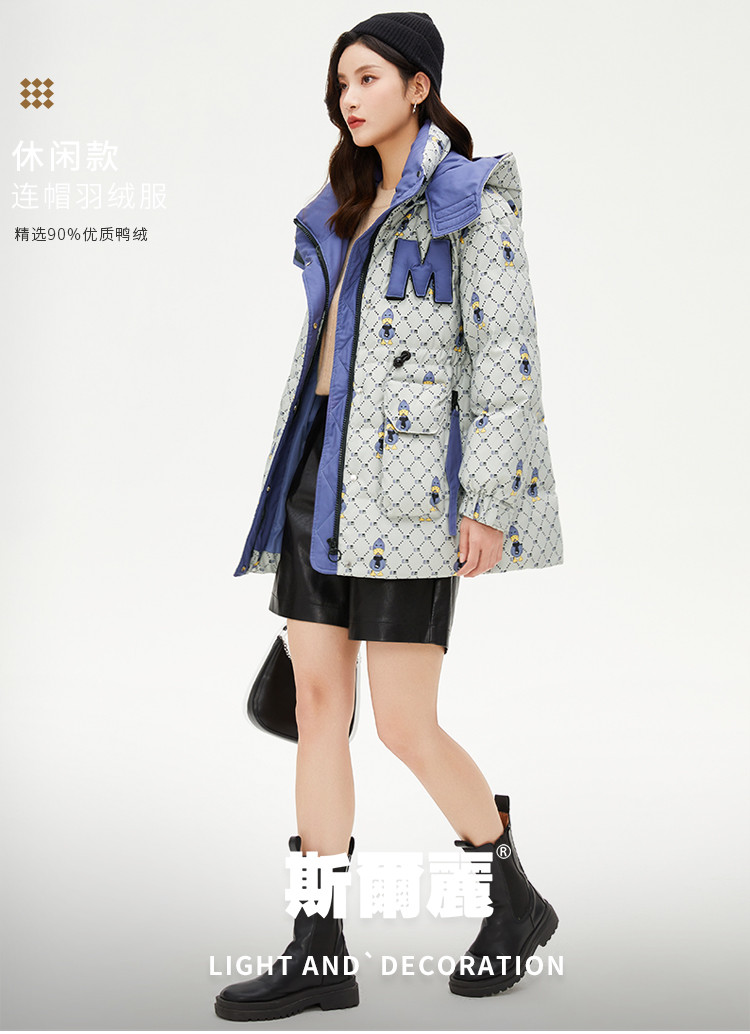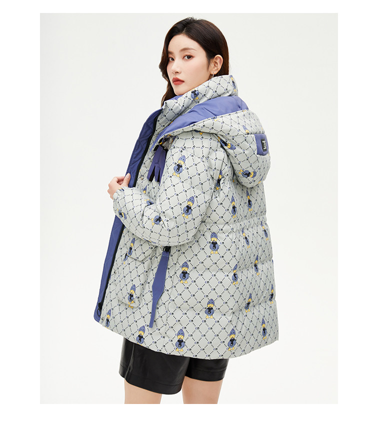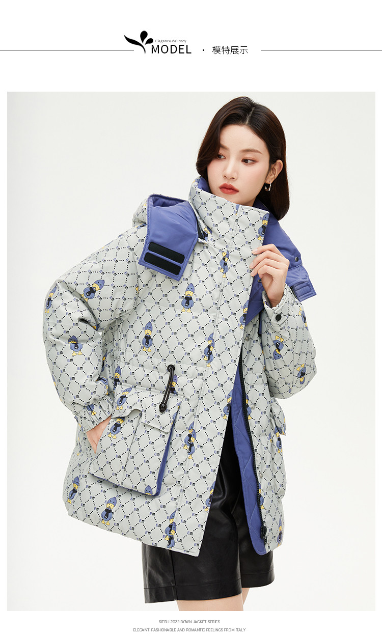 商品名称:休闲印花户外运动风女士冬季中长款带帽宽松羽绒服 303327