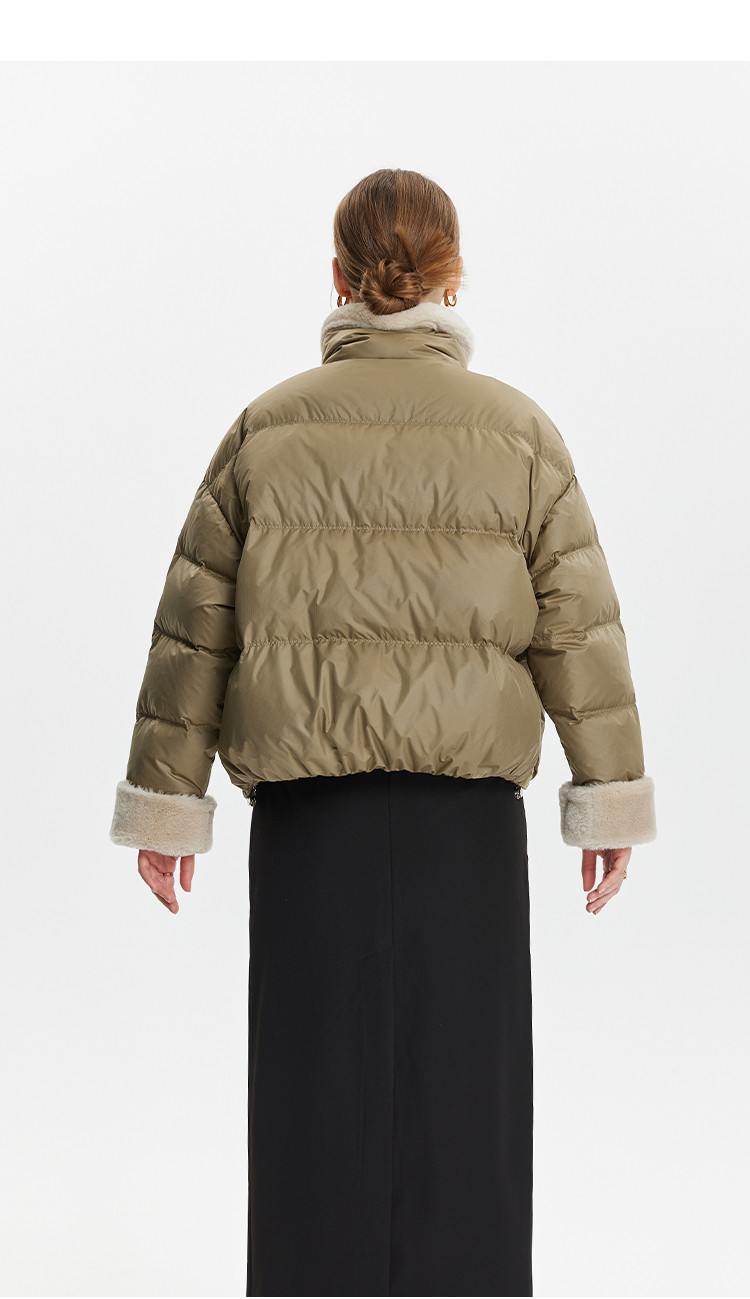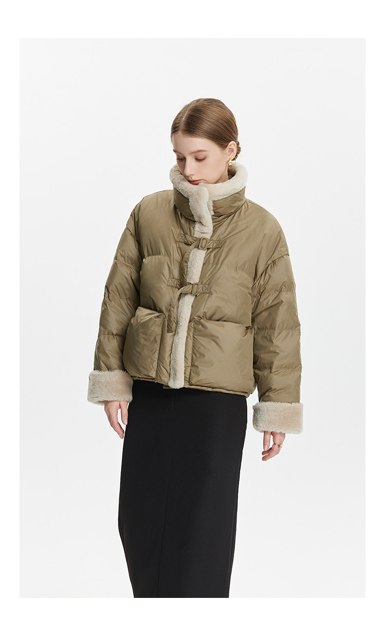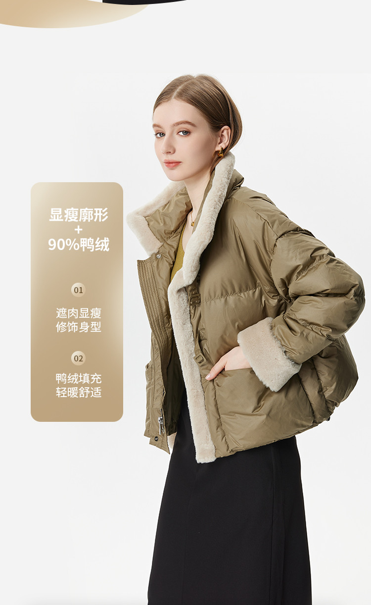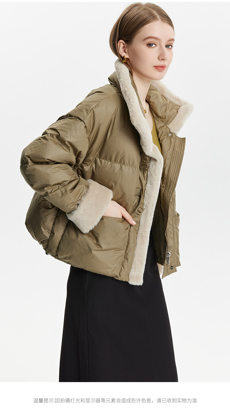 商品名称:【美式复古】拼接设计舒适鸭绒女式立领直筒短款羽绒服 501791