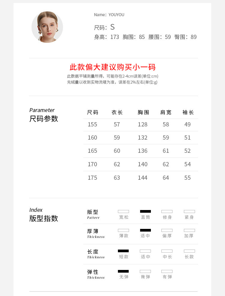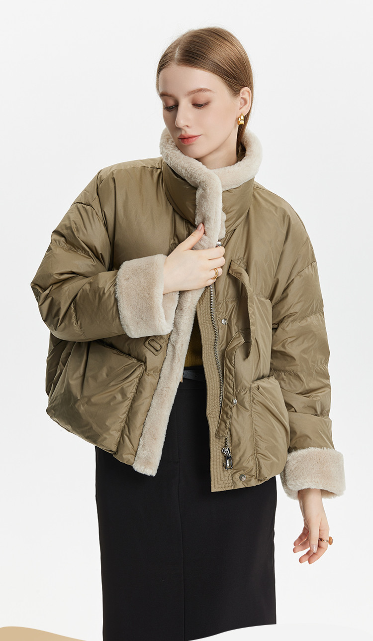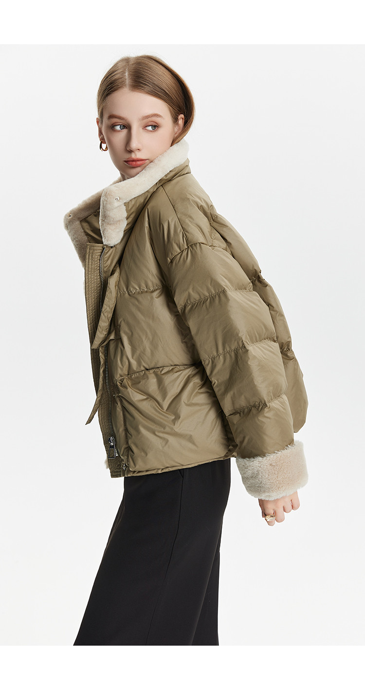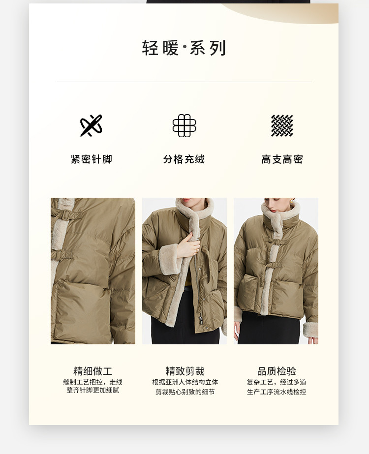 商品名称:【美式复古】拼接设计舒适鸭绒女式立领直筒短款羽绒服 501791