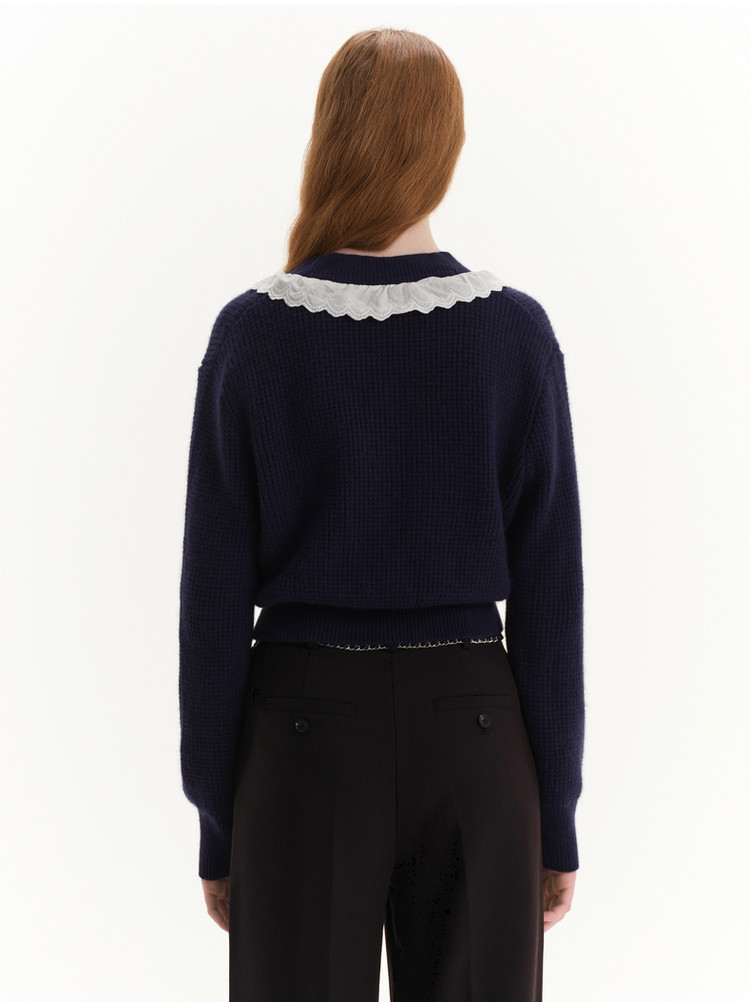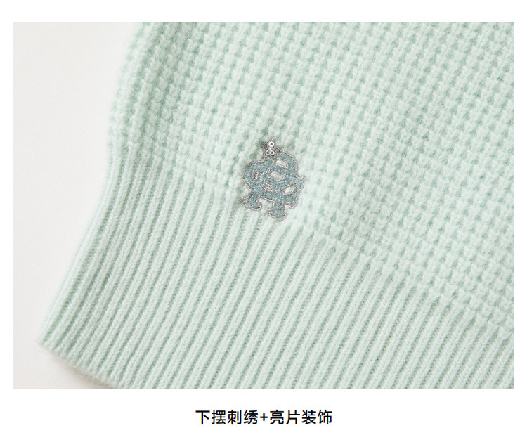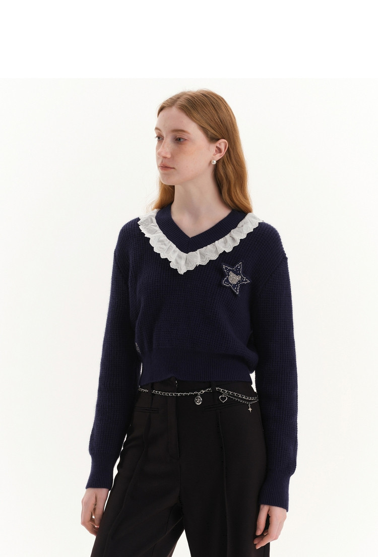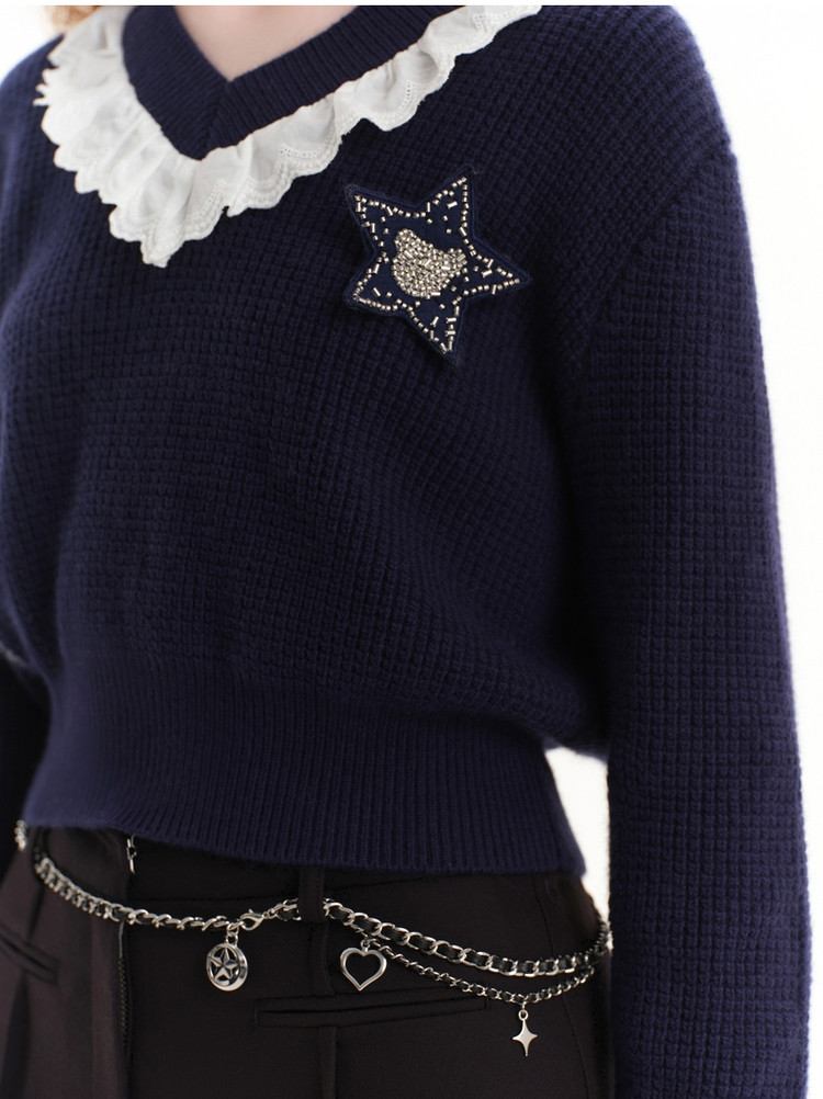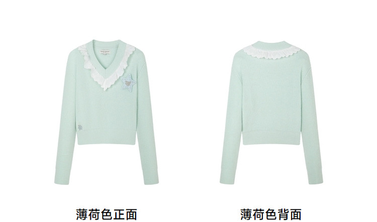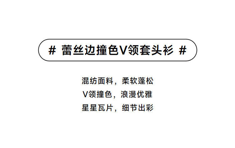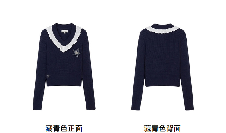 商品名称:小熊春秋款蕾丝边撞色V领套头衫毛衣针织衫女士 864321