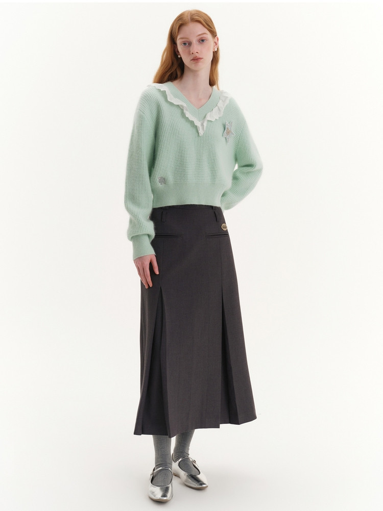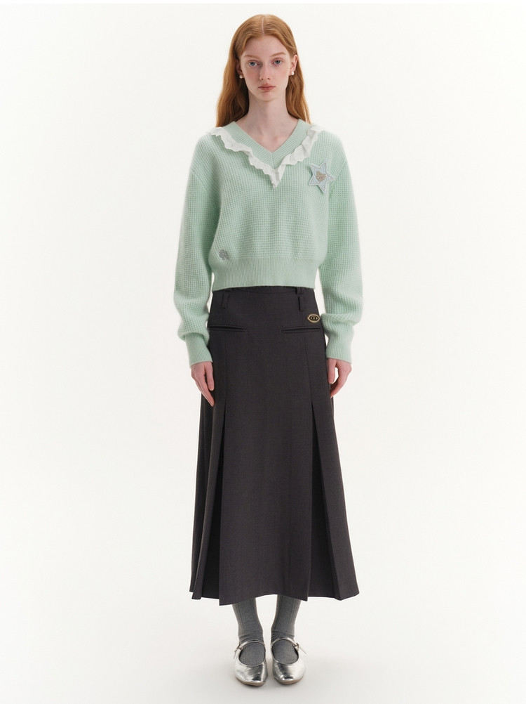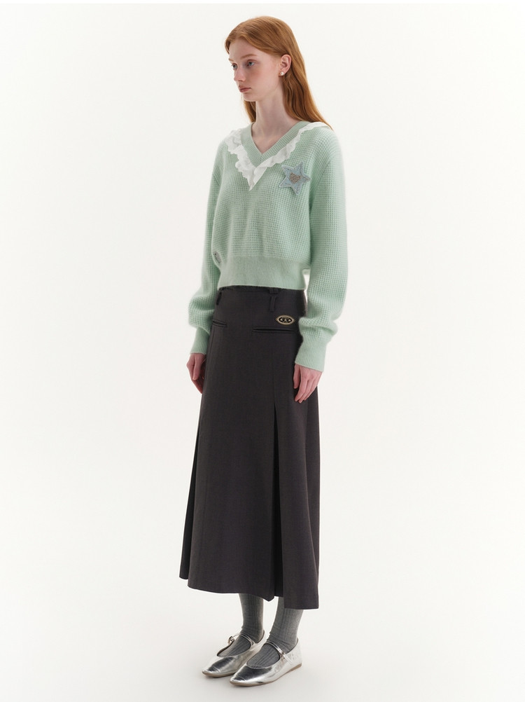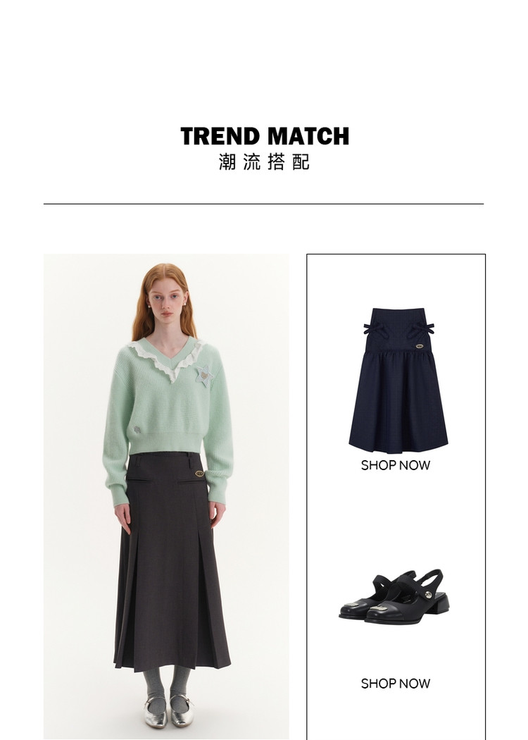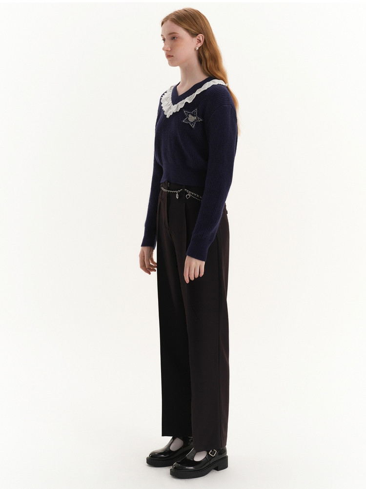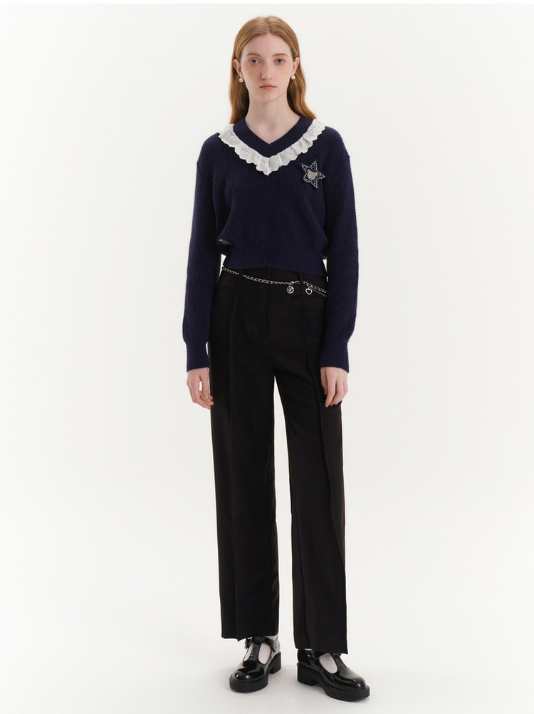 小熊春秋款蕾丝边撞色V领套头衫毛衣针织衫女士 864321