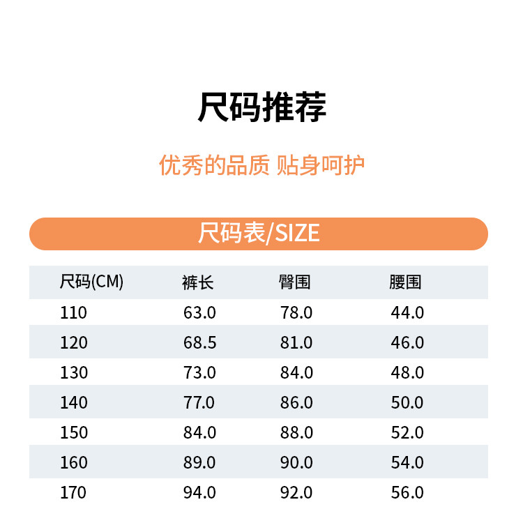 | 尺码 | 身高(cm) | 腰围(cm) | 裤长(cm) | 臀围(cm) | 适合年龄 | 号型 |