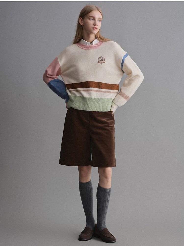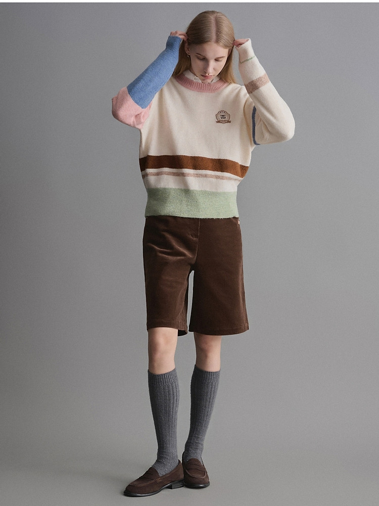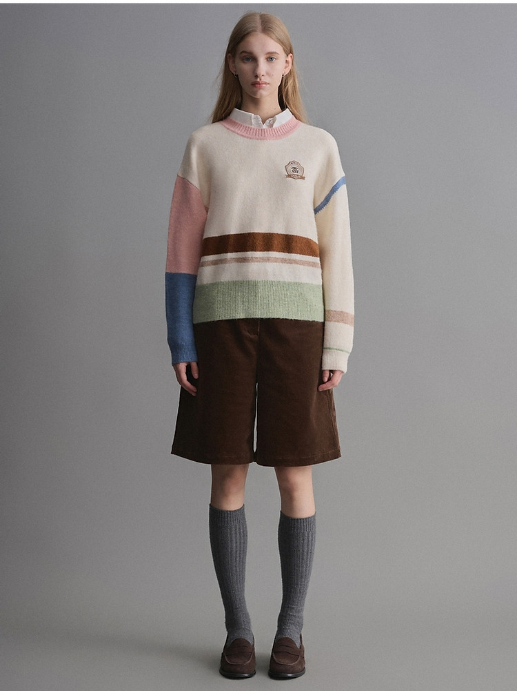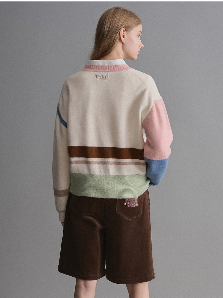 小熊春秋款设计感马卡龙撞色毛衣圆领针织衫上衣女装 858177