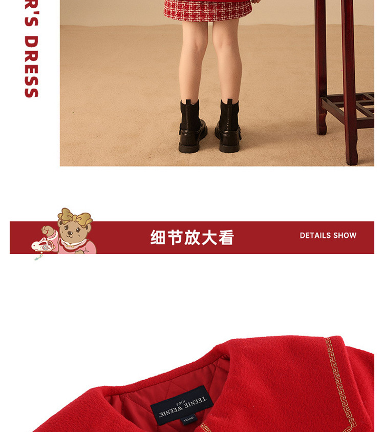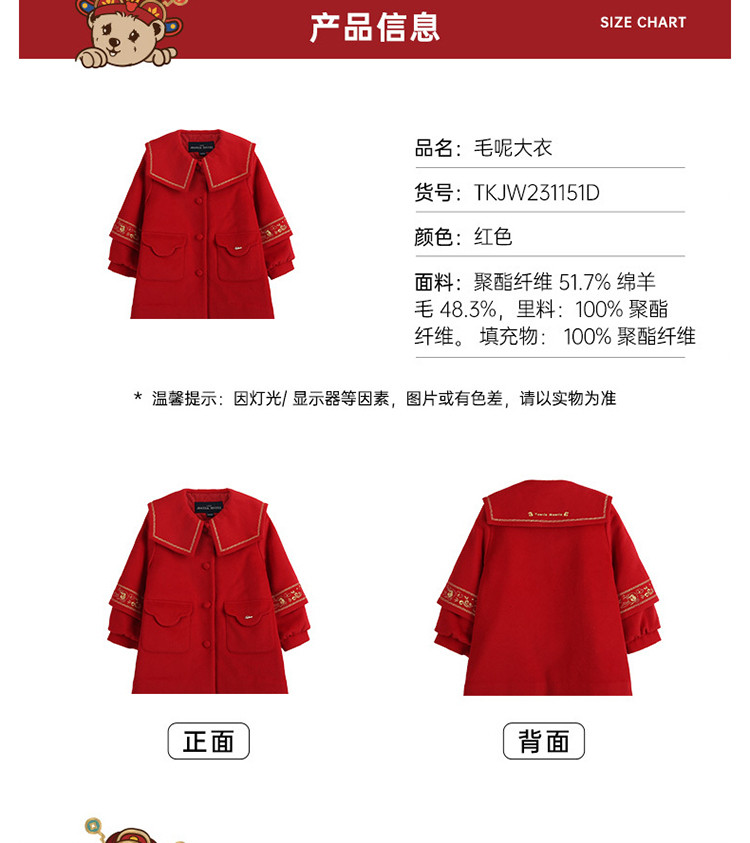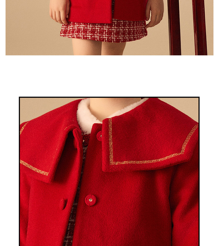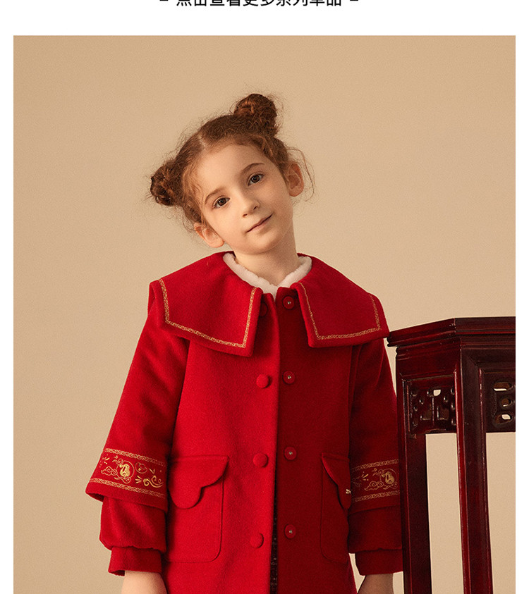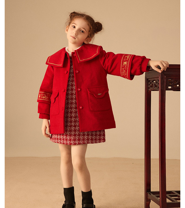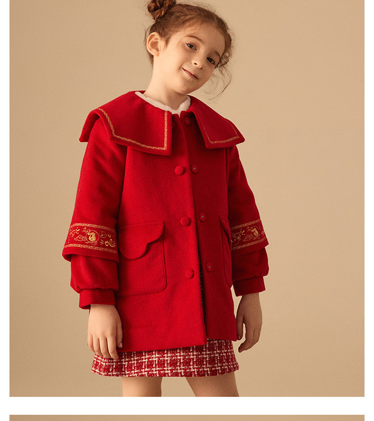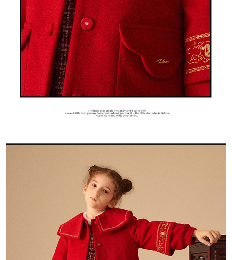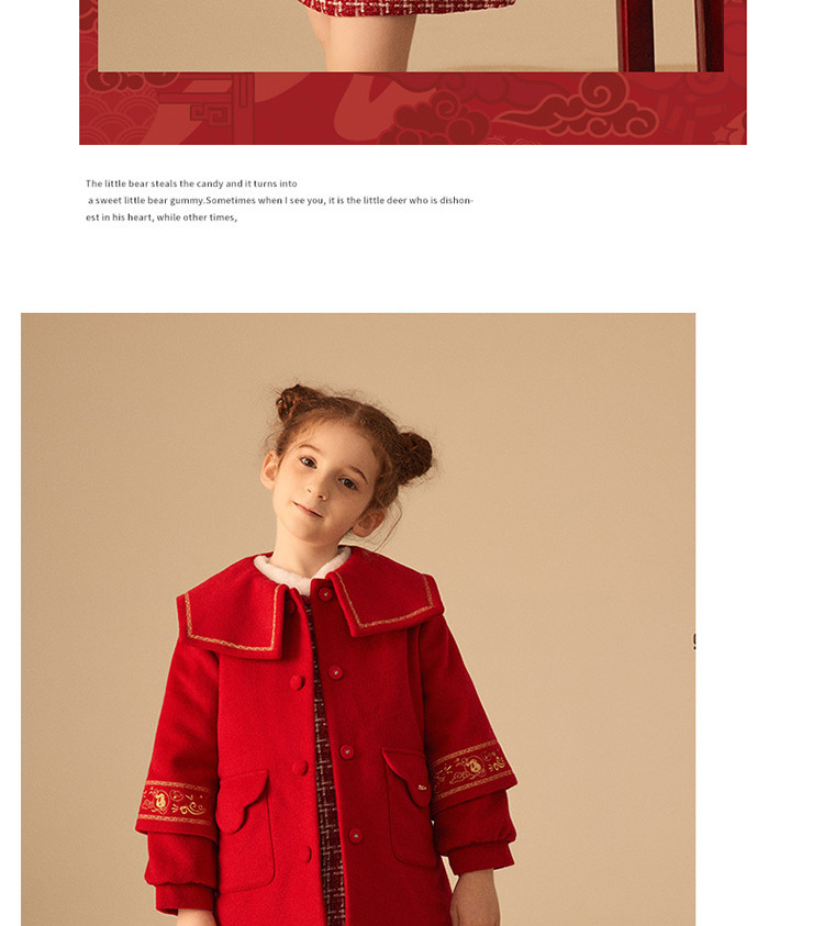 商品名称:【国风】小熊童装红色女童秋季中国红翻领毛呢大衣 445057