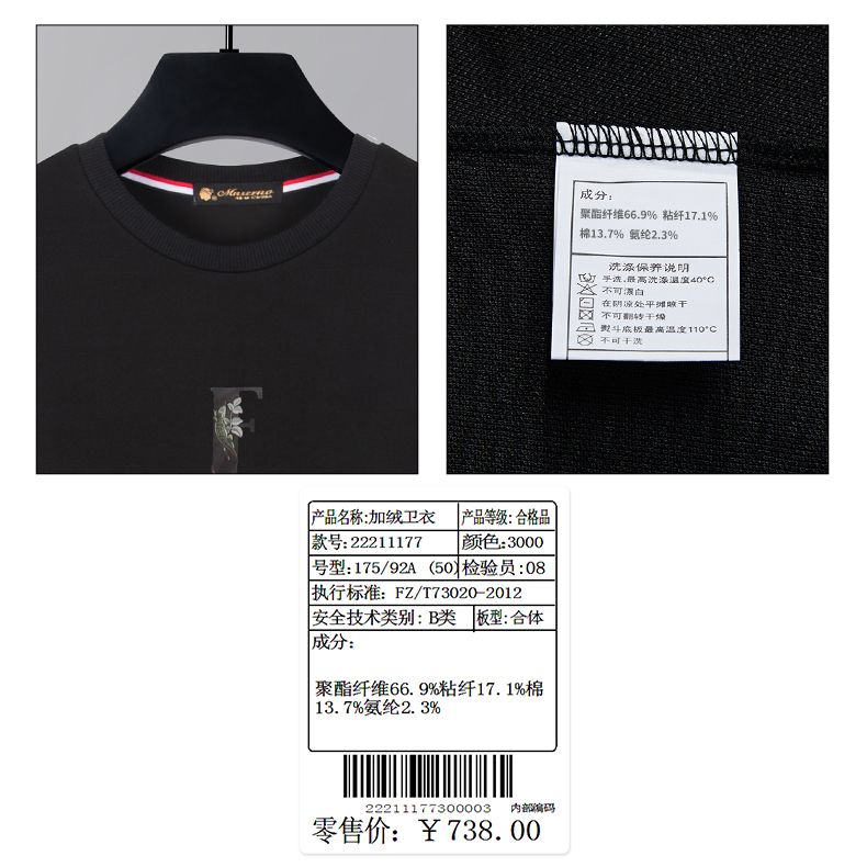 商品名称:曼西尔奴男士舒适百搭弹力加绒保暖卫衣22211177TM