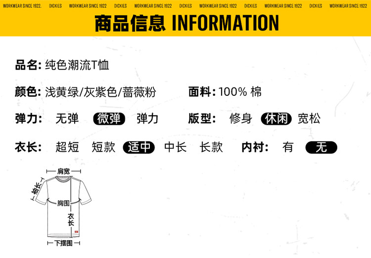 商品名称:Dickies男女同款纯棉休闲五分袖T恤 DK010570 458576