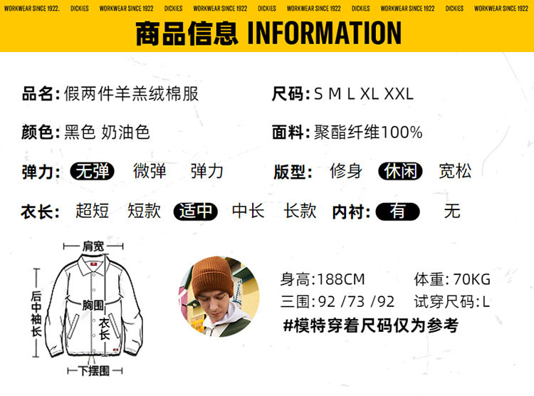 商品名称:Dickies男式假两件羊羔绒厚夹克 DK009488 554320
