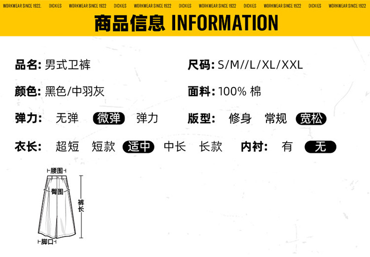 商品名称:Dickies男式23春秋季运动束脚卫裤 DK010349 857360