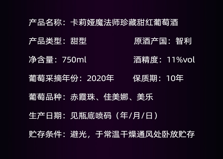 商品名称:智利原酒进口卡莉娅魔法师珍藏甜红葡萄酒750ml*6瓶整箱装