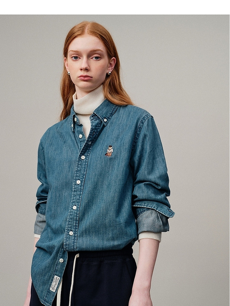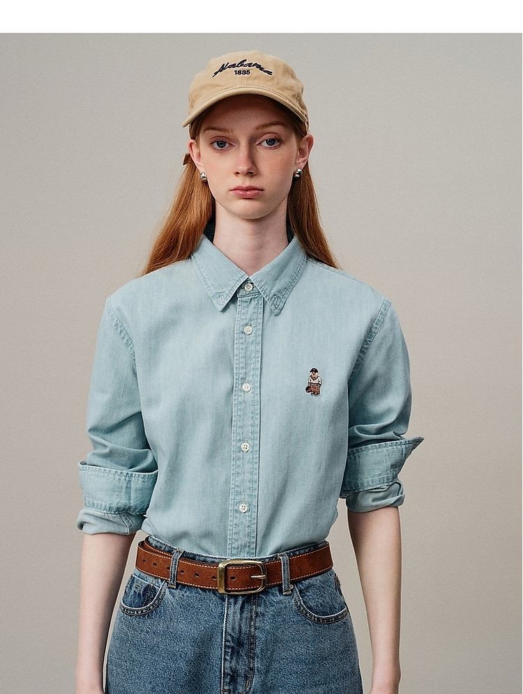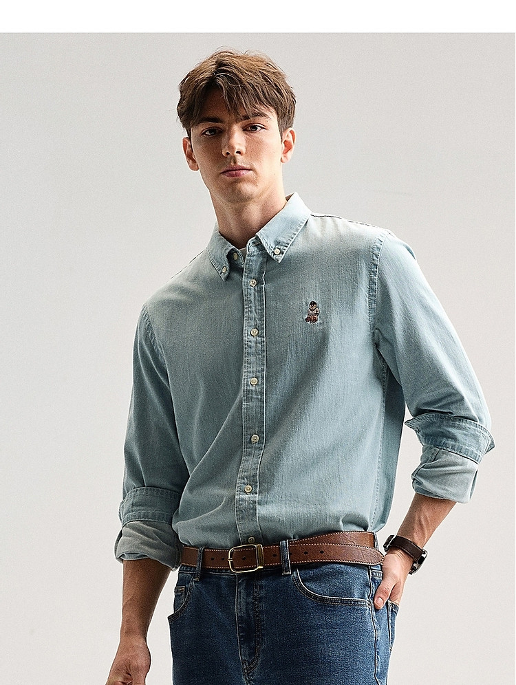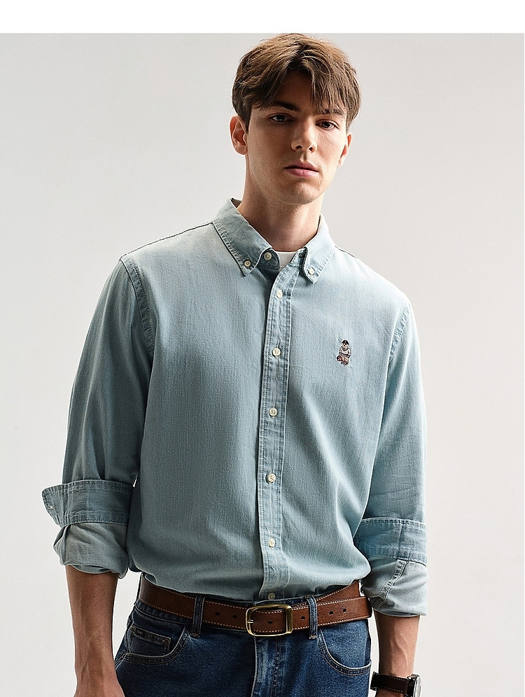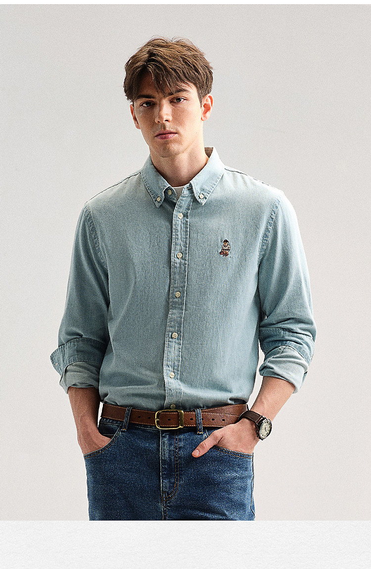 小熊男装简约时尚潮流牛仔衬衫春季休闲美式复古宽松情侣衬衣 276737