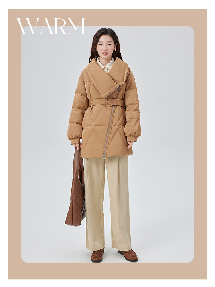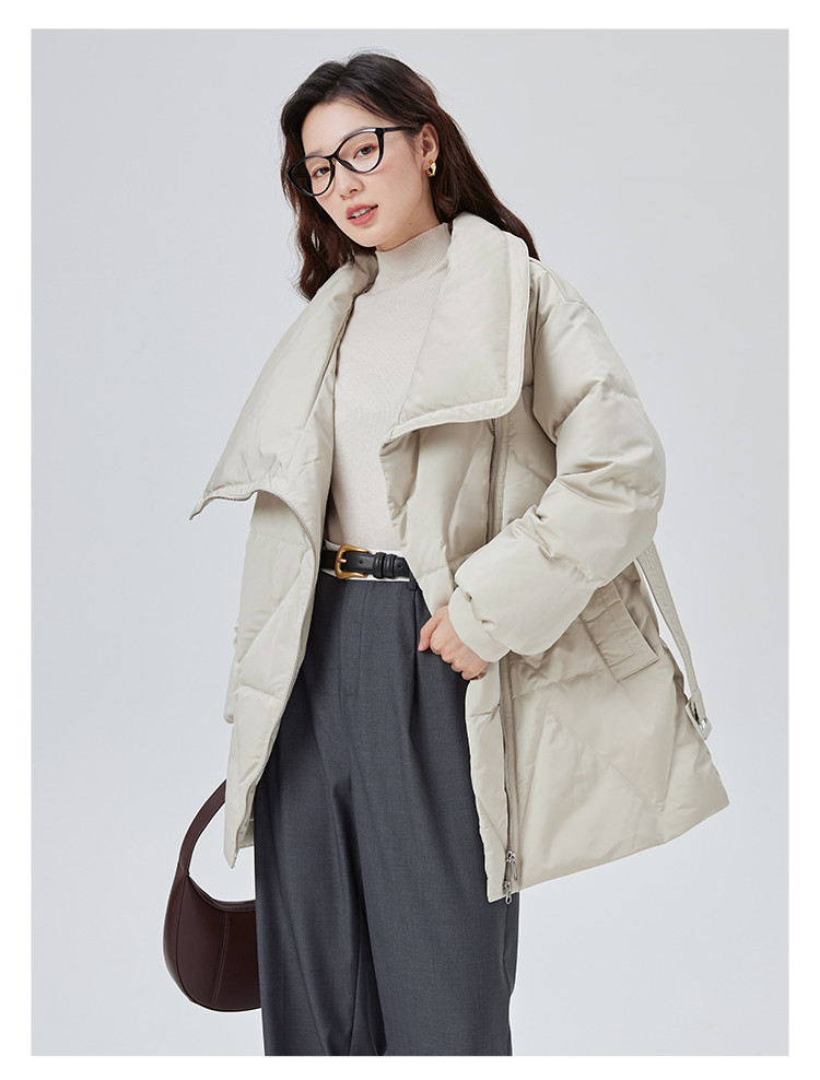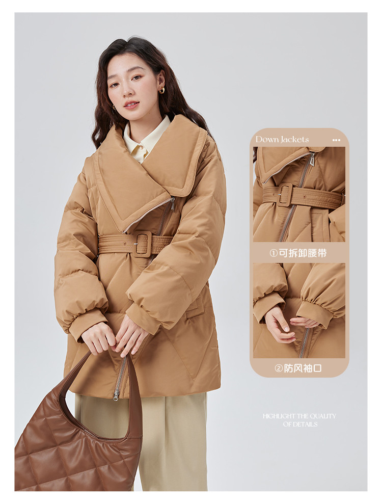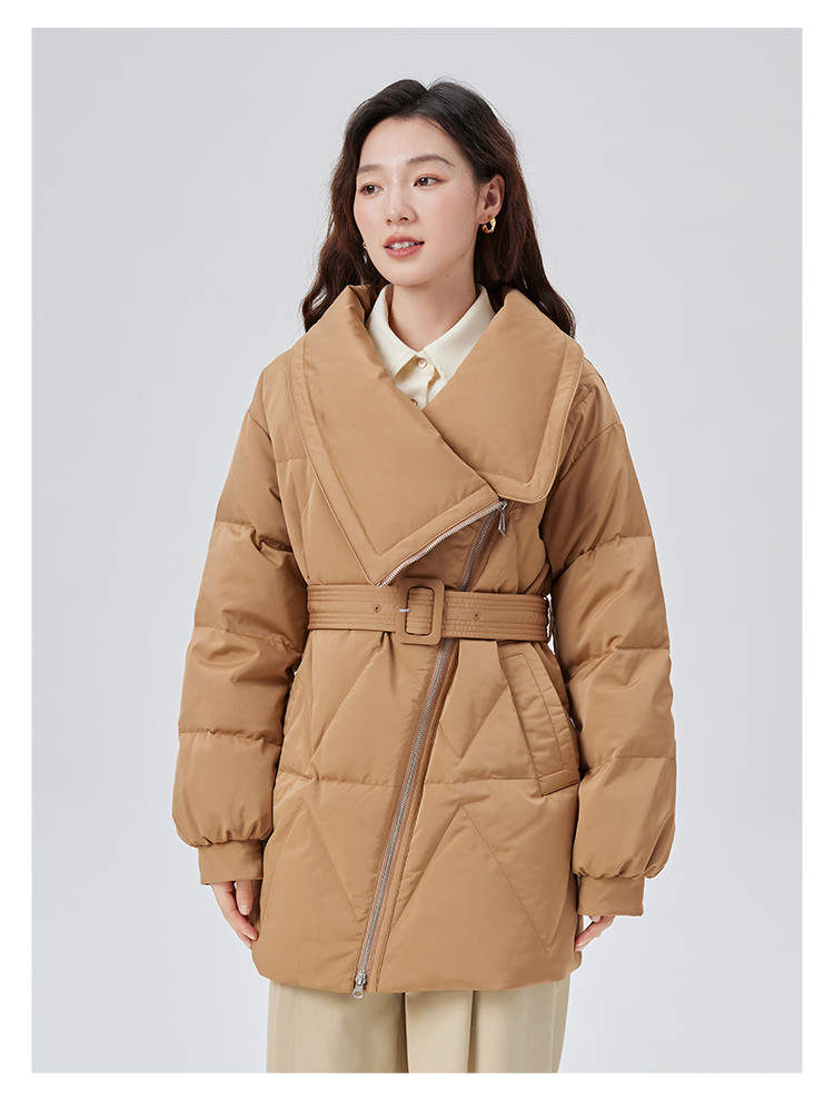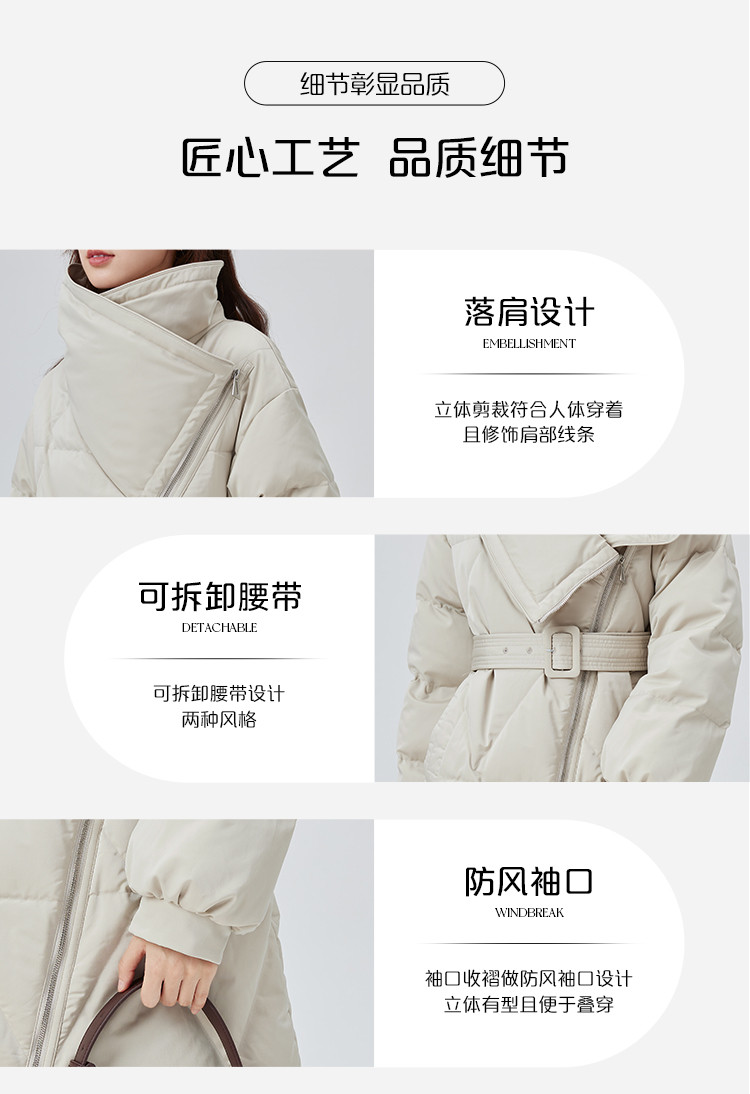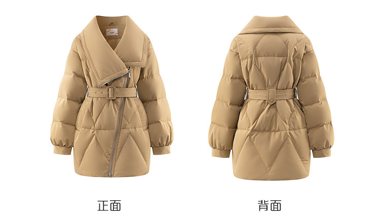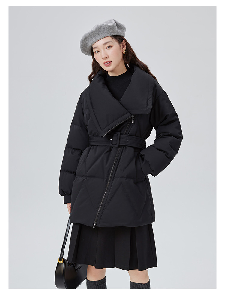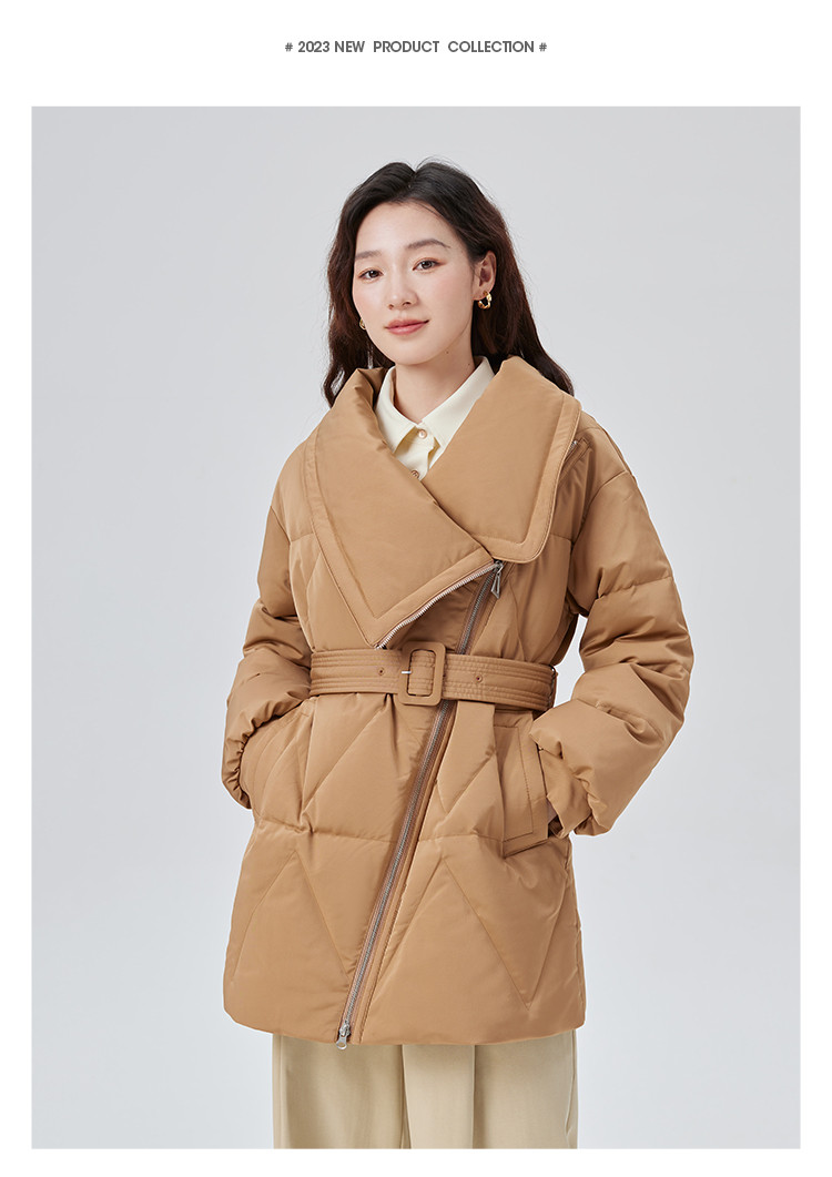 商品名称:【明星同款】时尚大翻领斜门襟收腰鹅绒羽绒服女中长款 100054