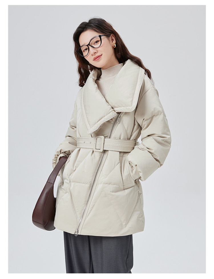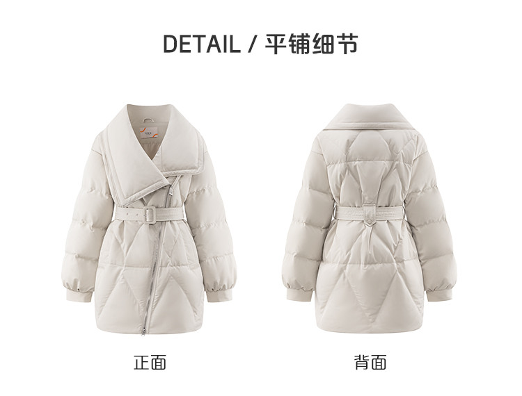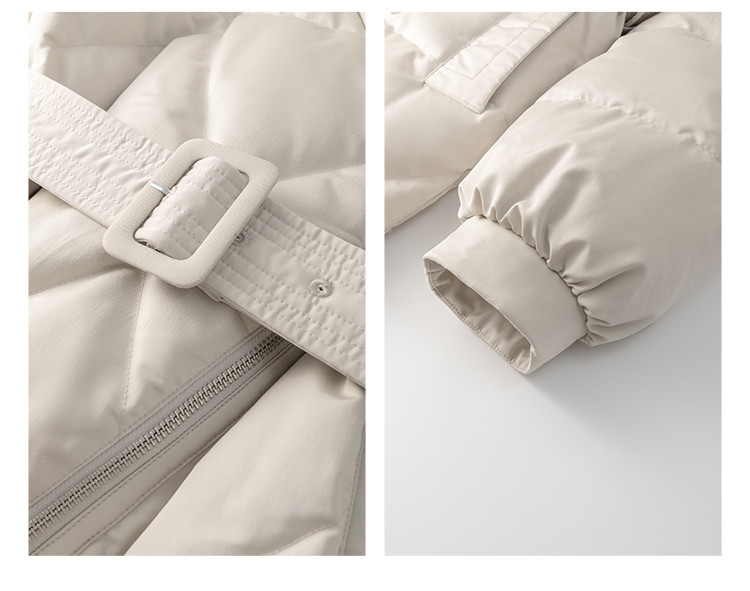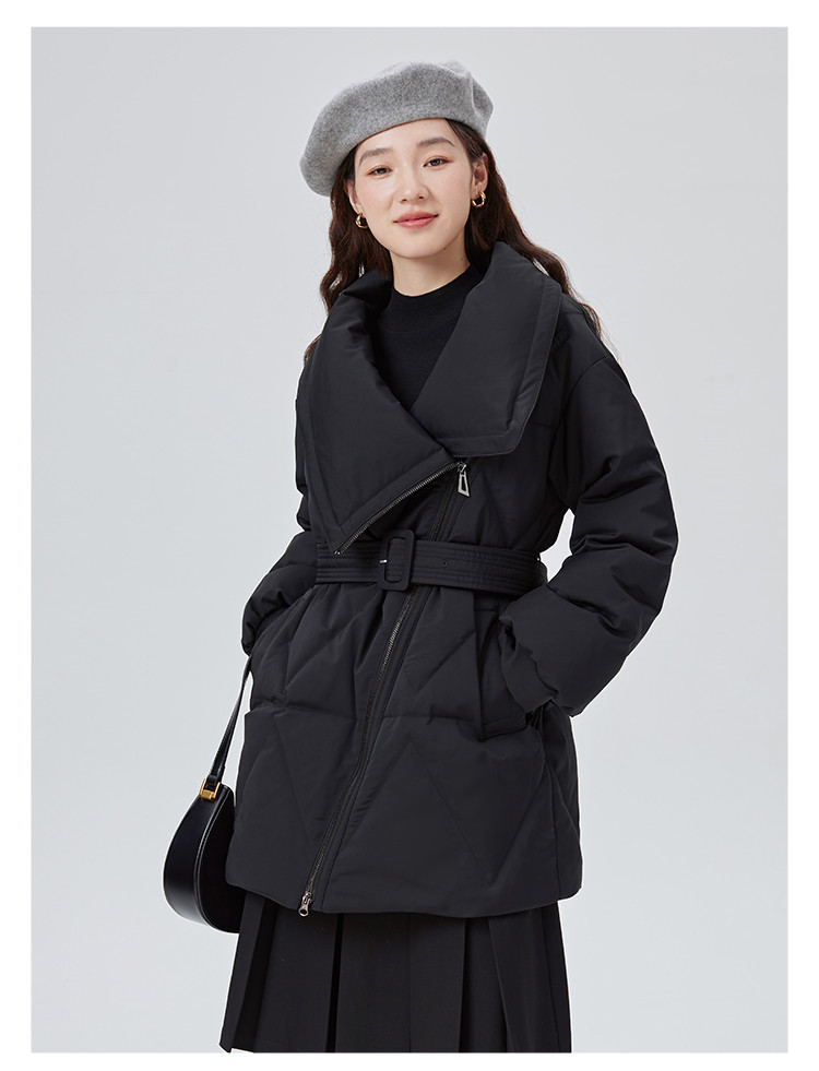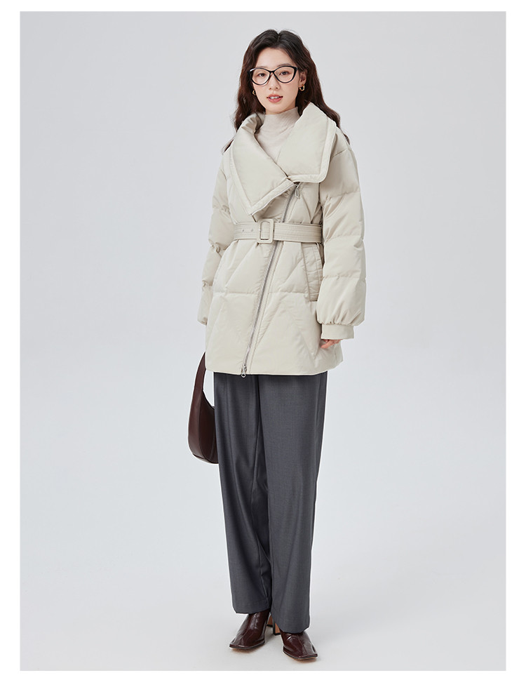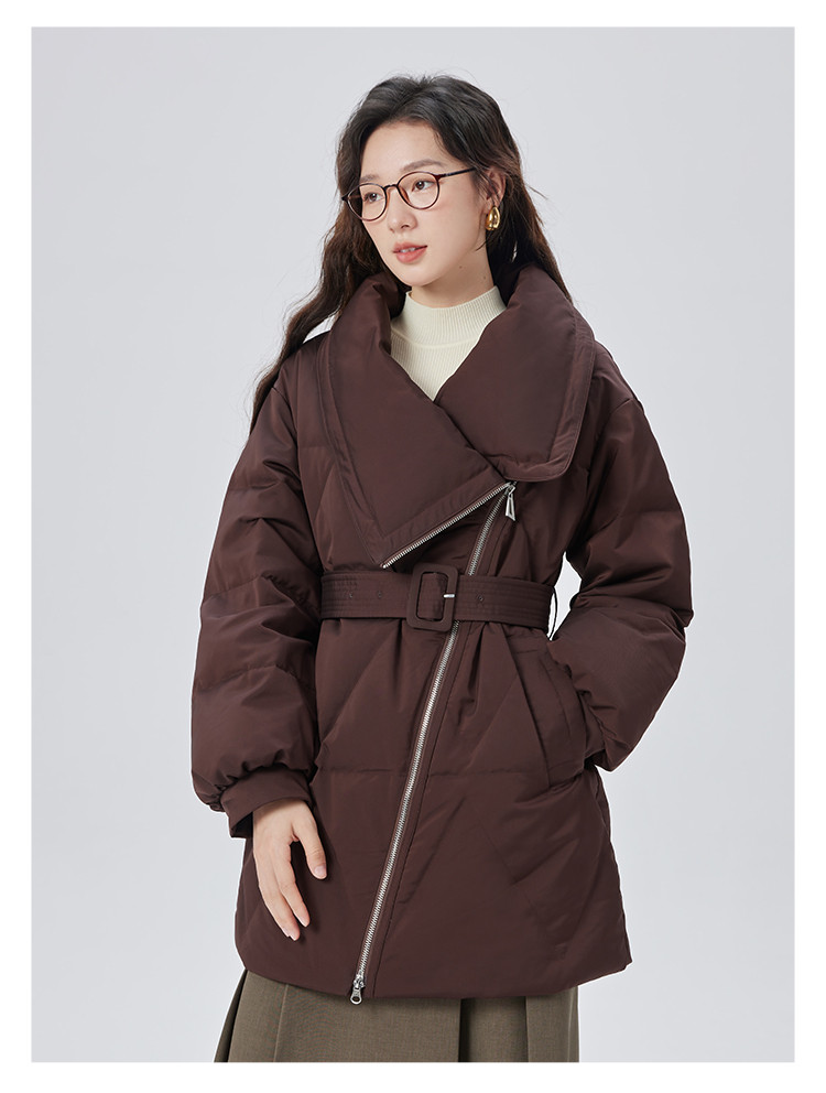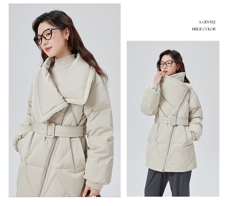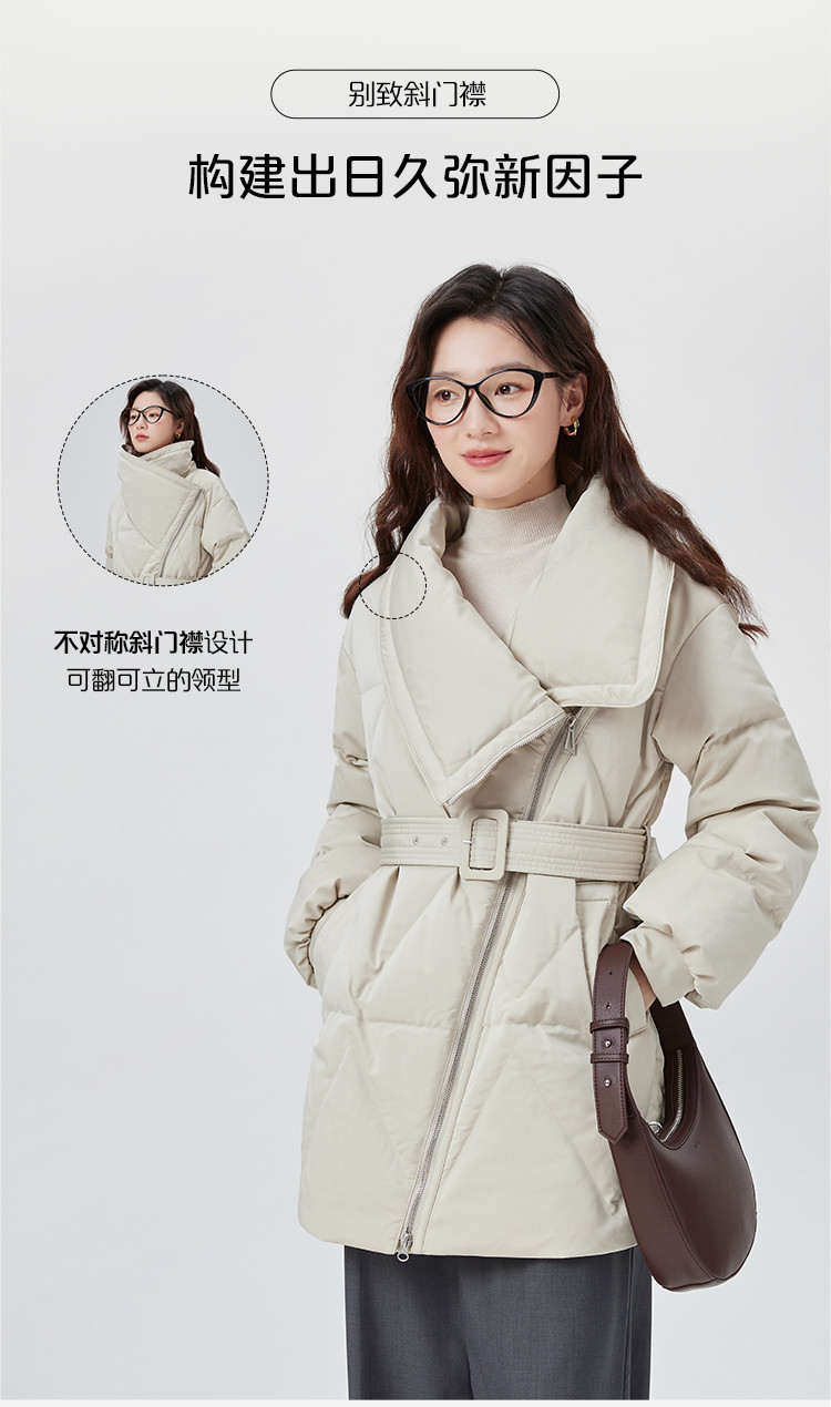 商品名称:【明星同款】时尚大翻领斜门襟收腰鹅绒羽绒服女中长款 100054