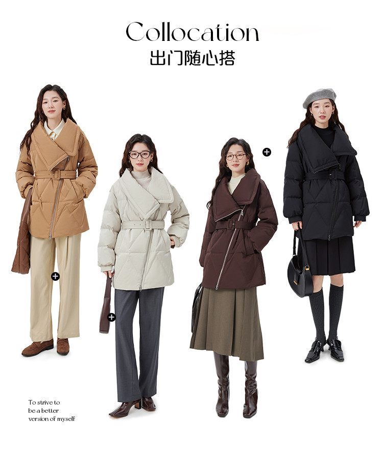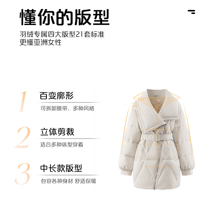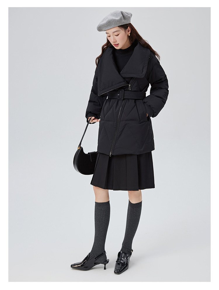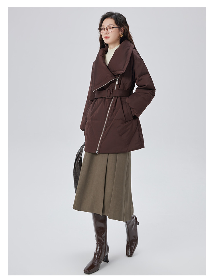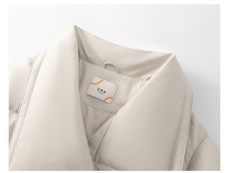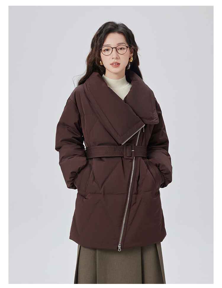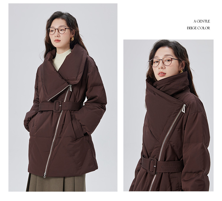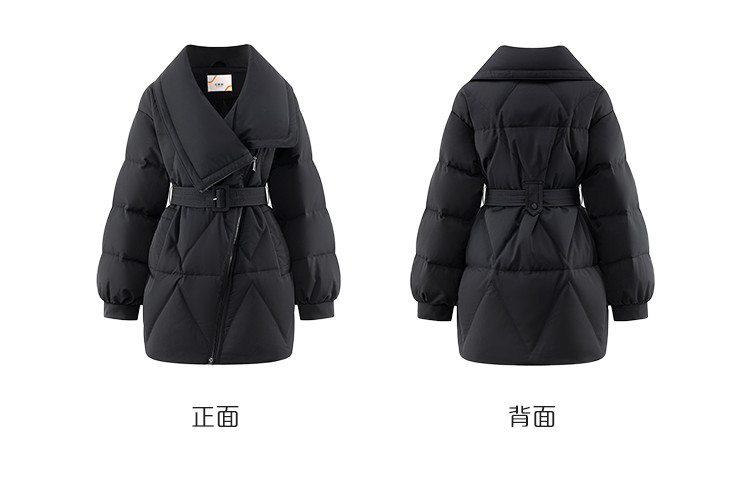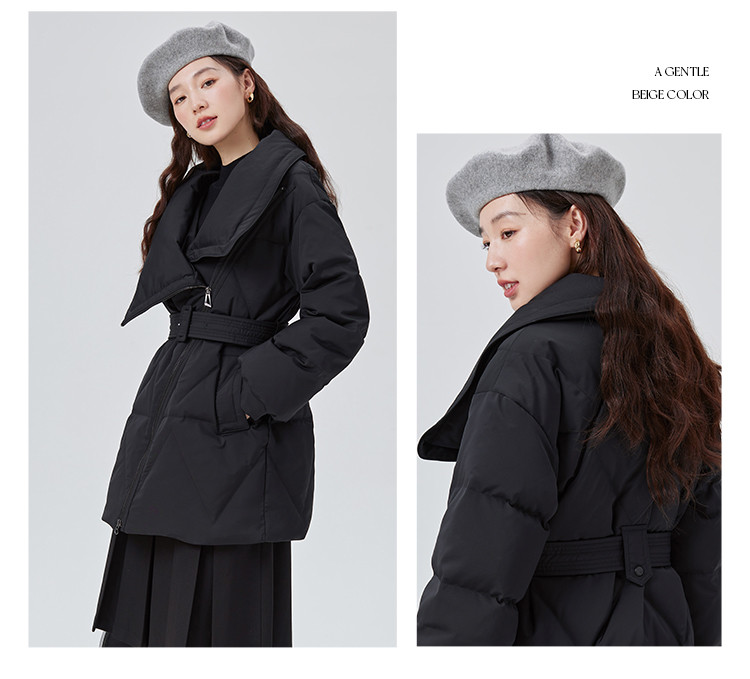 商品名称:【明星同款】时尚大翻领斜门襟收腰鹅绒羽绒服女中长款 100054