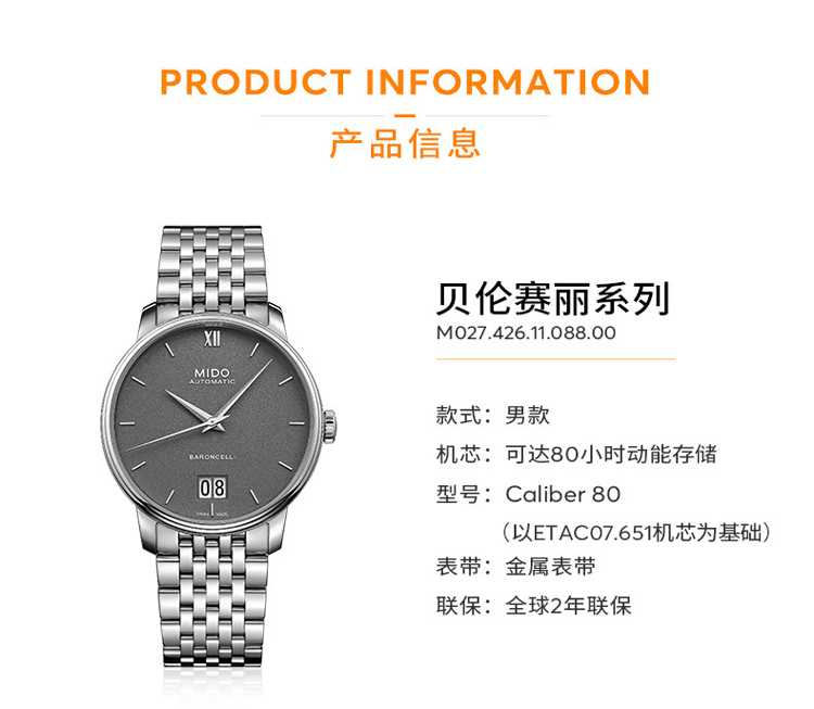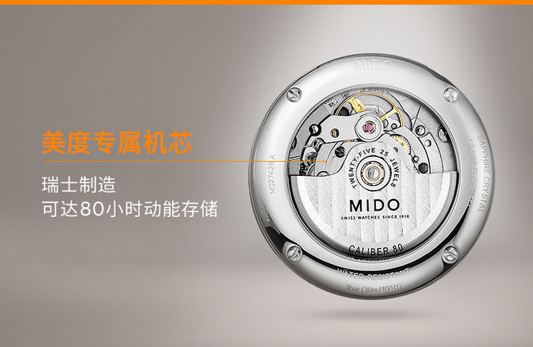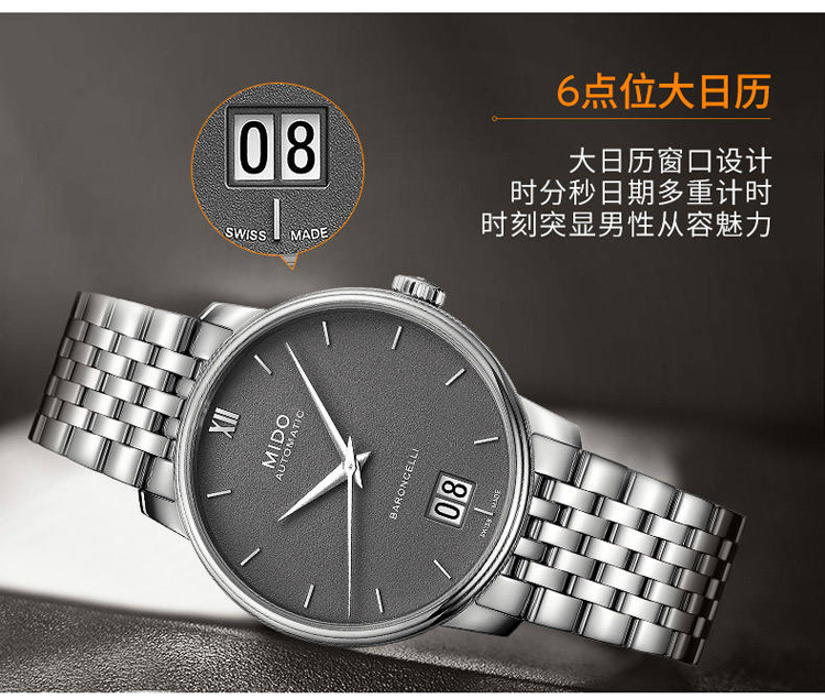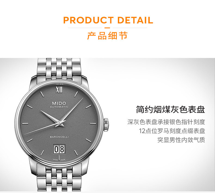 商品名称:MIDO美度 贝伦赛丽 百年纪念自动机械男表灰盘钢带 (不支持无理由退换货)
