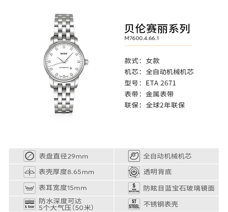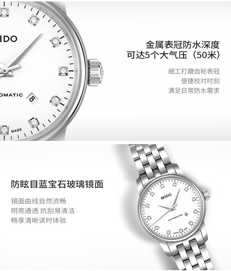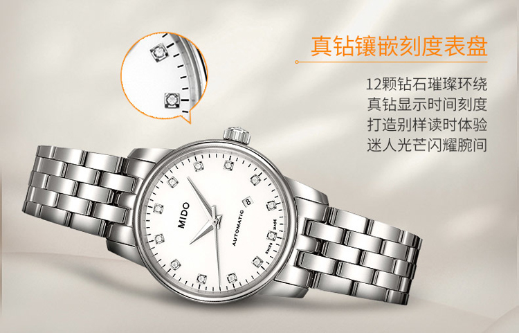 商品名称:MIDO美度 贝伦赛丽系列 自动机械女款钻表银盘钢带 (不支持无理由退换货)