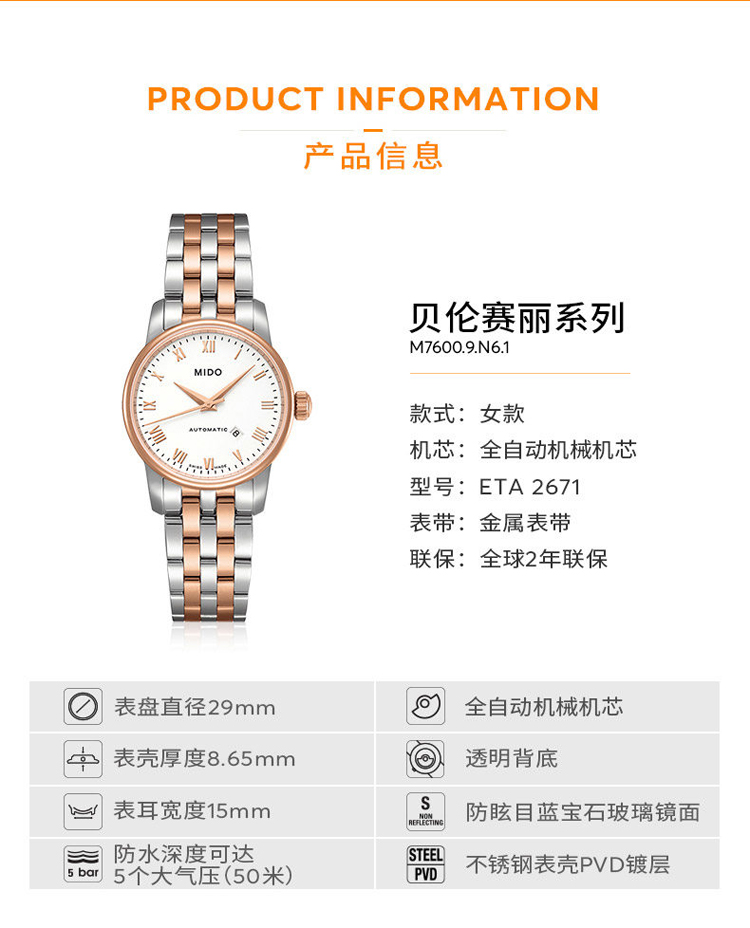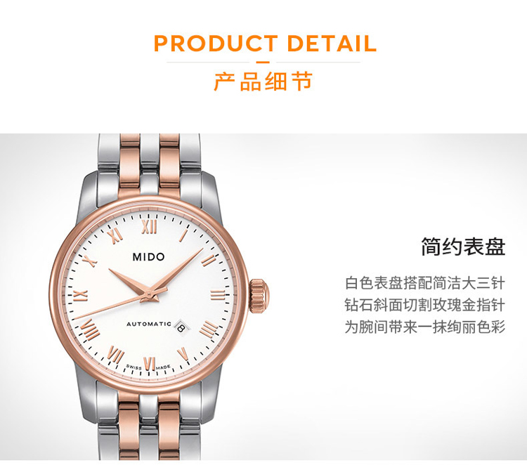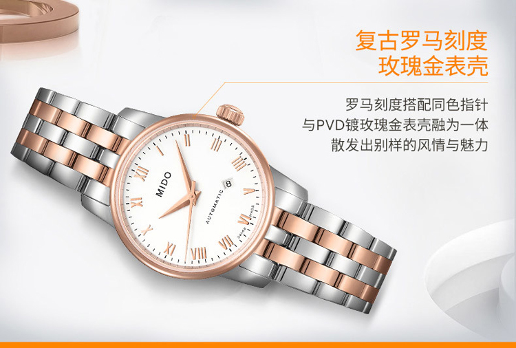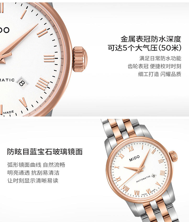 商品名称:MIDO美度 贝伦赛丽系列 自动机械女表间金白盘钢带(不支持无理由退换货)