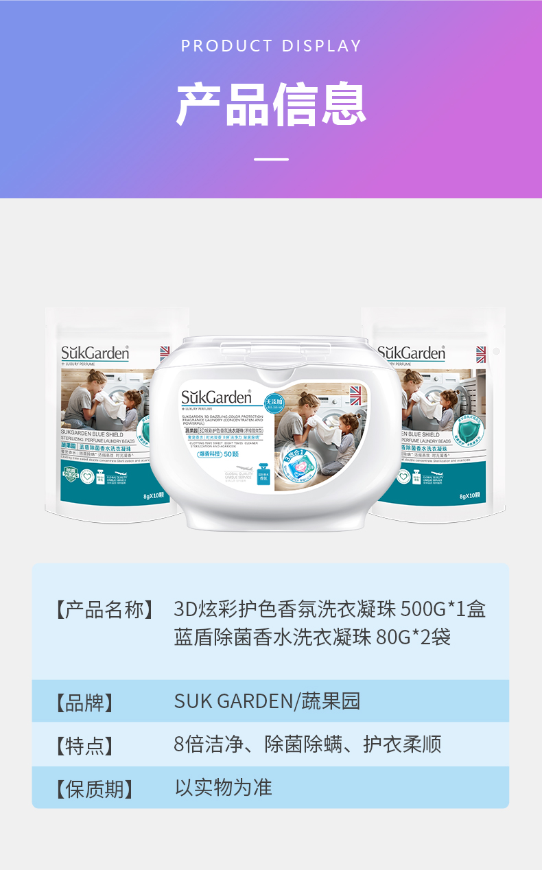 商品名称:蔬果园3D洗衣凝珠(浓缩强效型)-10g*50颗*1盒+蔬果园蓝盾蓝风铃香水洗衣凝珠-8g*10颗(袋装)*2袋