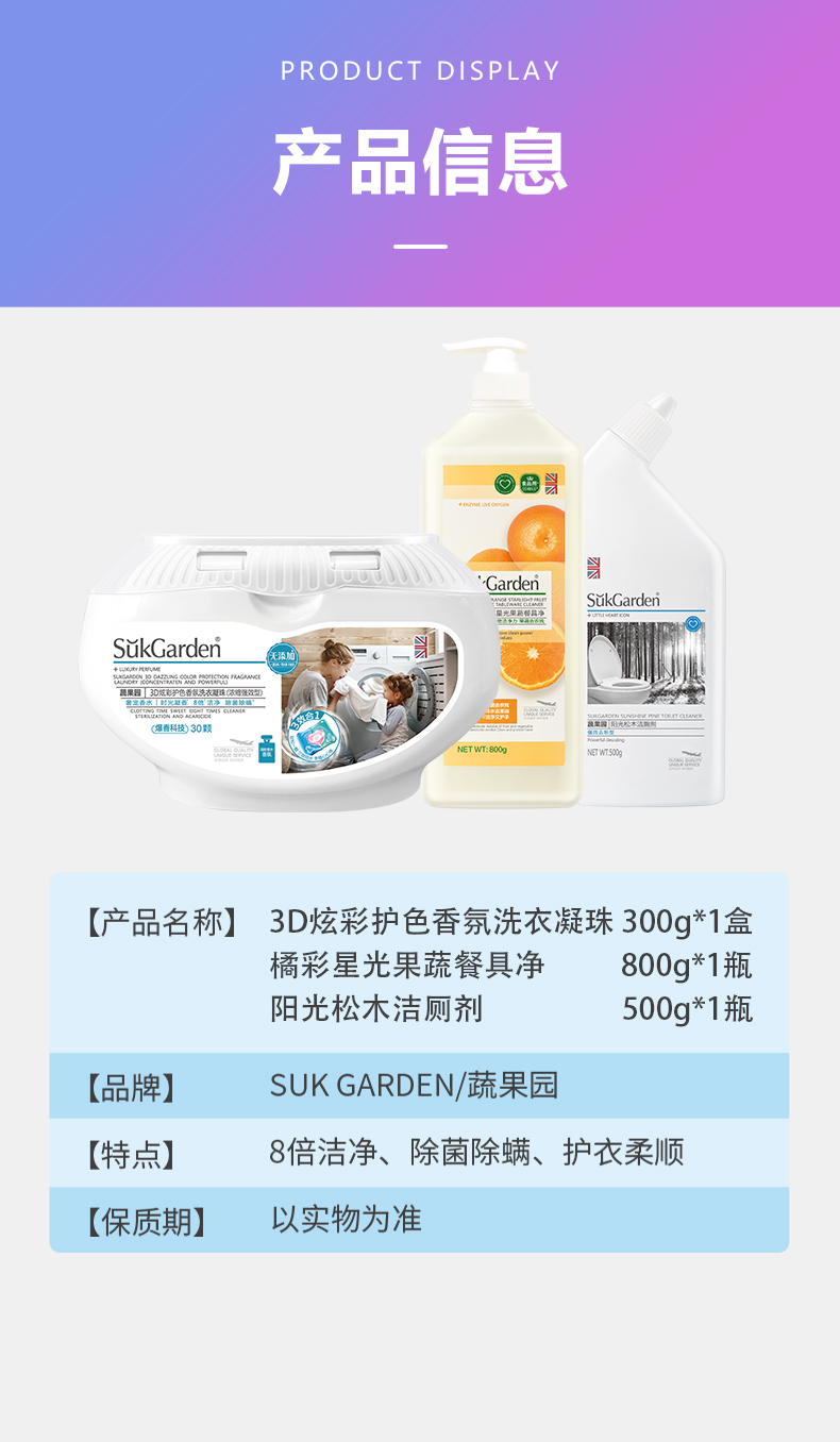 商品名称:蔬果园3D洗衣凝珠(浓缩强效型)+蔬果园橘采星光果蔬餐具净+蔬果园阳光松木洁厕剂
