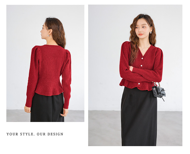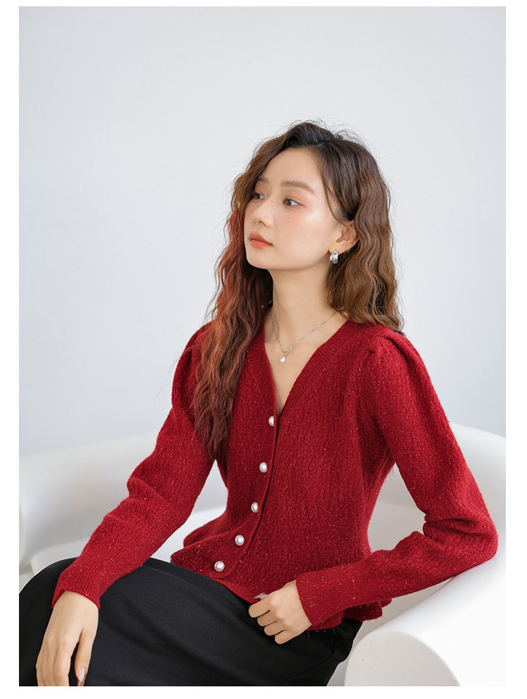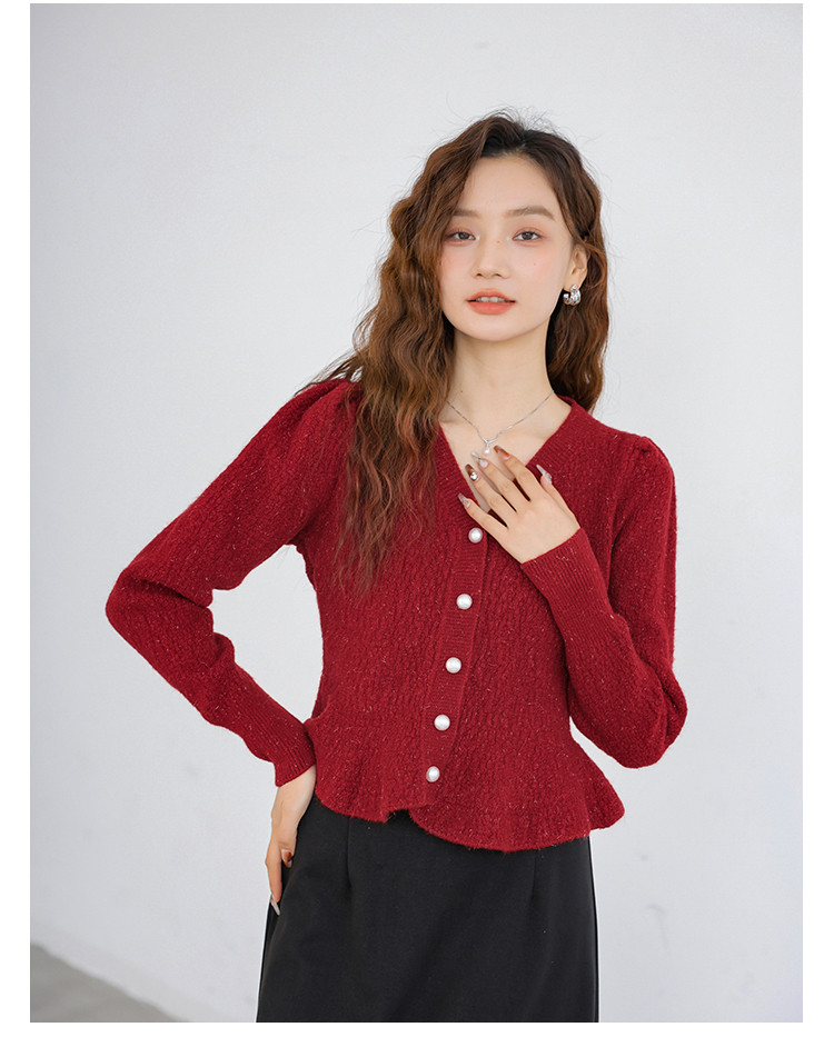 商品名称:红色针织衫气质V领针织开衫单排扣针织衫女 432131