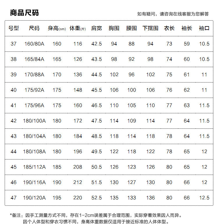 | 尺码 | 衣长(cm) | 肩宽(cm) | 腰围(cm) | 袖长(cm) | 领围(cm) | 胸围(cm) | 下摆围(cm) | 号型 |