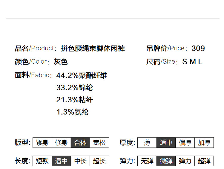 商品名称:【时尚运动懒人】秋系绳拼色束脚休闲裤字女长裤女裤 665601