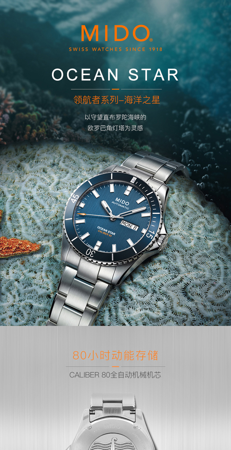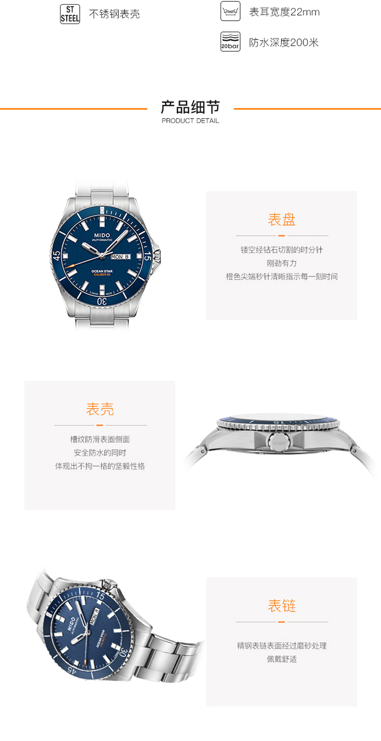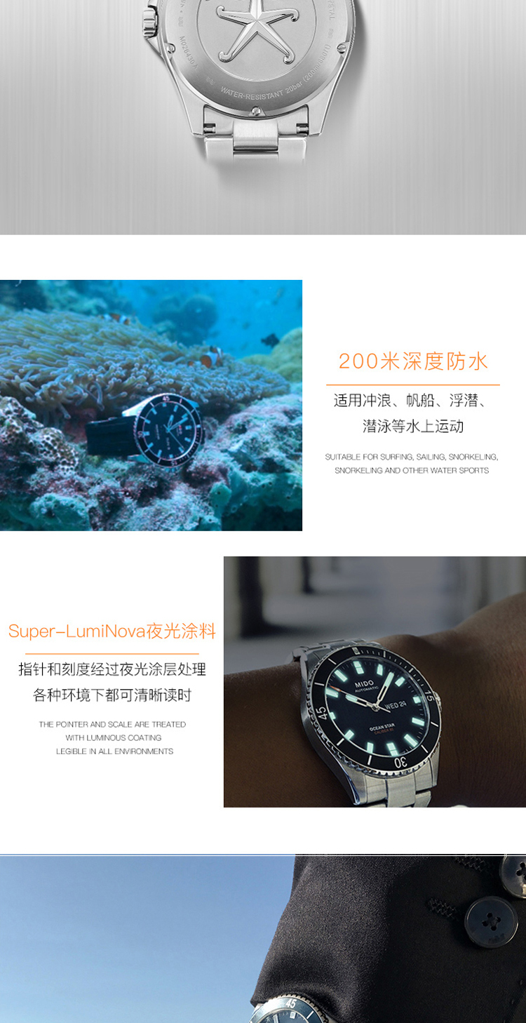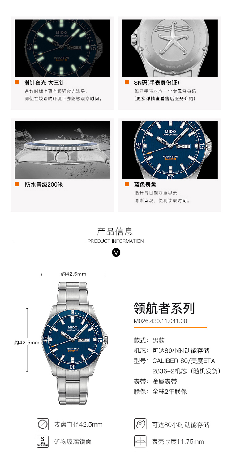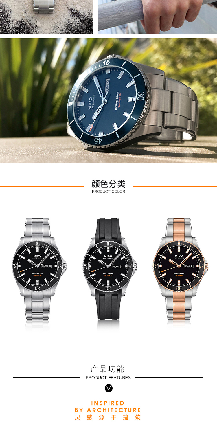 商品名称:MIDO美度 Ocean Star领航者系列全自动机械防水运动潜水男士腕表(不支持无理由退换货)