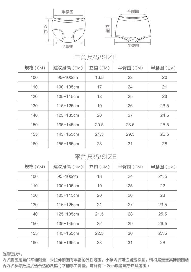 | 尺码 | 臀围(cm) | 适合年龄 | 腰围(cm) | 号型 |