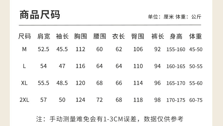 | 尺码 | 肩宽(cm) | 袖长(cm) | 上装号型 | 下装号型 | 衣长(cm) | 身高(cm) | 腰围(cm) | 裤长(cm) | 体重(kg) | 臀围(cm) | 胸围(cm) | 号型 |