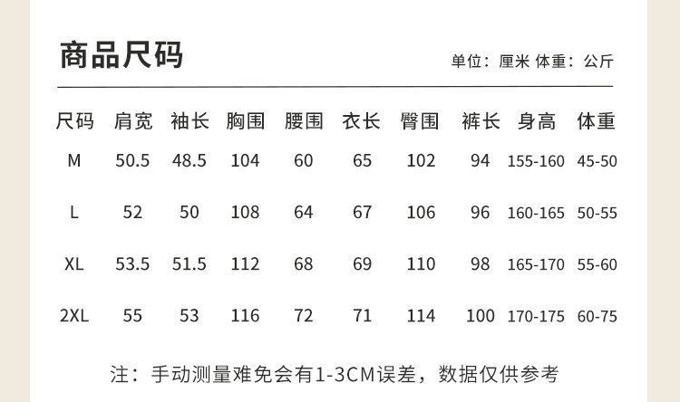 | 尺码 | 肩宽(cm) | 袖长(cm) | 上装号型 | 下装号型 | 衣长(cm) | 身高(cm) | 腰围(cm) | 裤长(cm) | 体重(kg) | 臀围(cm) | 胸围(cm) | 号型 |