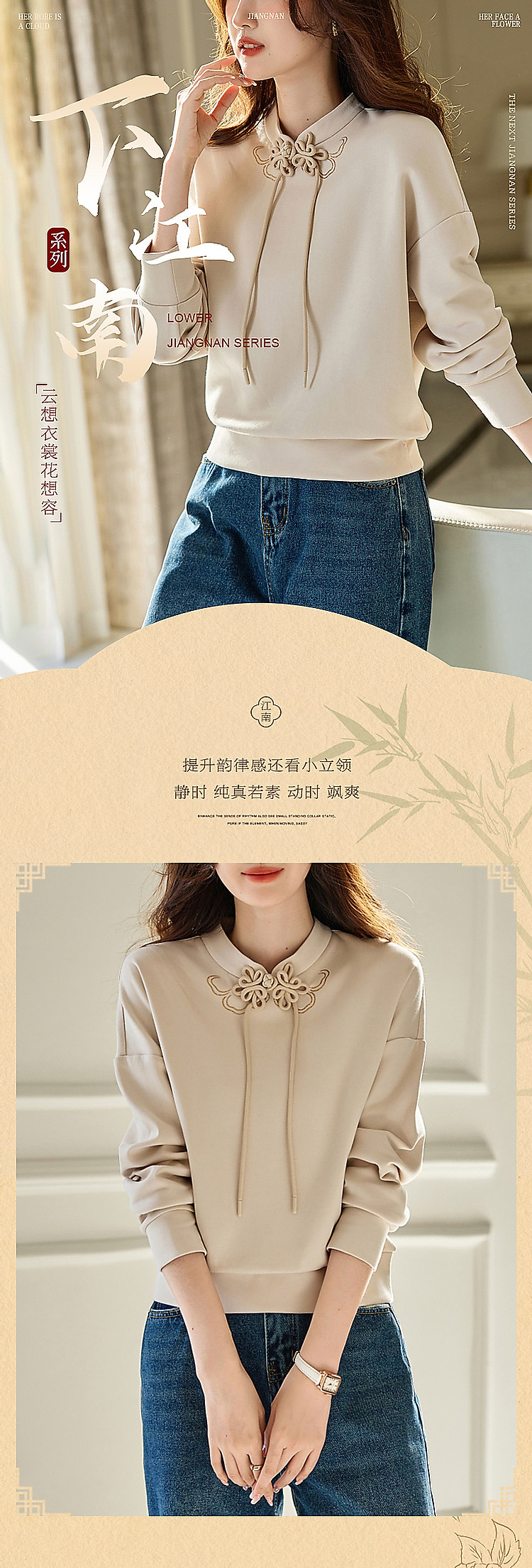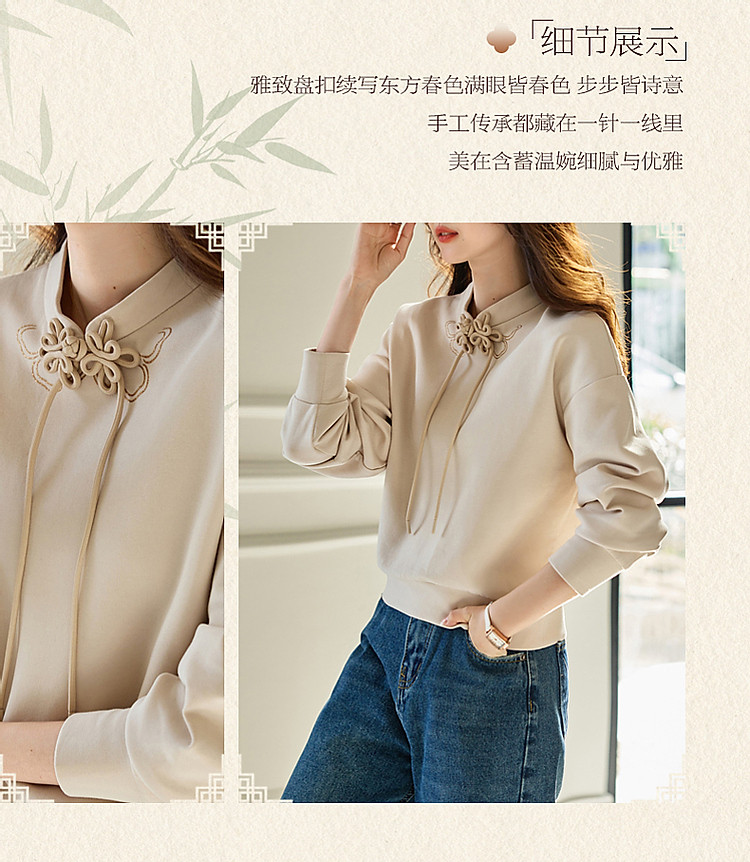 商品名称:【国风新中式】春秋复古立领精致烫印盘扣舒适空气层卫衣女上衣 699841