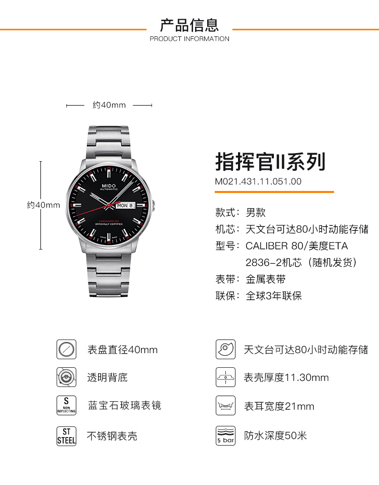 商品名称:MIDO美度 指挥官系列天文台认证男士腕表 (不支持无理由退换货)