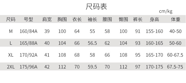 | 尺码 | 肩宽(cm) | 袖长(cm) | 衣长(cm) | 身高(cm) | 腰围(cm) | 裤长(cm) | 体重(kg) | 臀围(cm) | 胸围(cm) | 号型 |