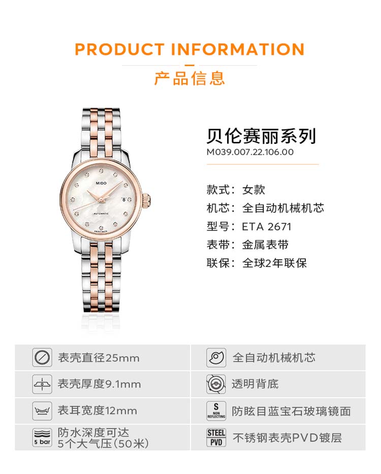 商品名称:MIDO美度 贝伦赛丽系列迷你小表盘女士腕表 (不支持无理由退换货)