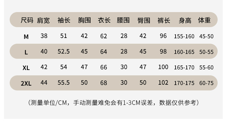 | 尺码 | 肩宽(cm) | 袖长(cm) | 上装号型 | 下装号型 | 衣长(cm) | 身高(cm) | 腰围(cm) | 裤长(cm) | 体重(kg) | 臀围(cm) | 胸围(cm) | 号型 |