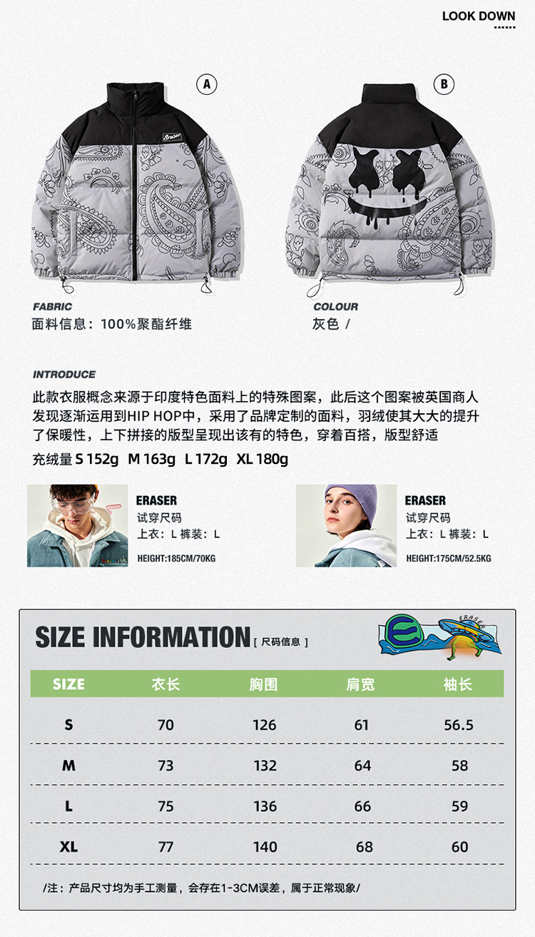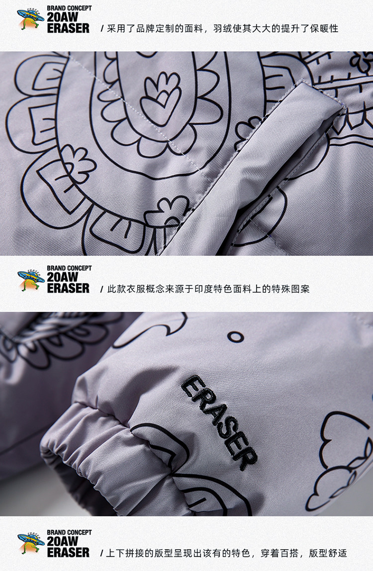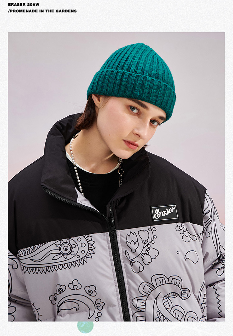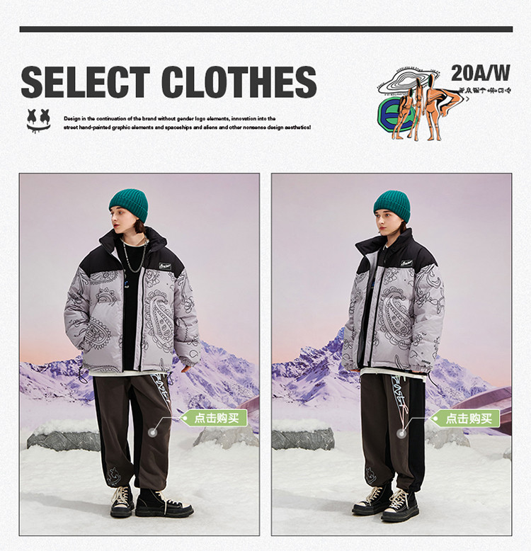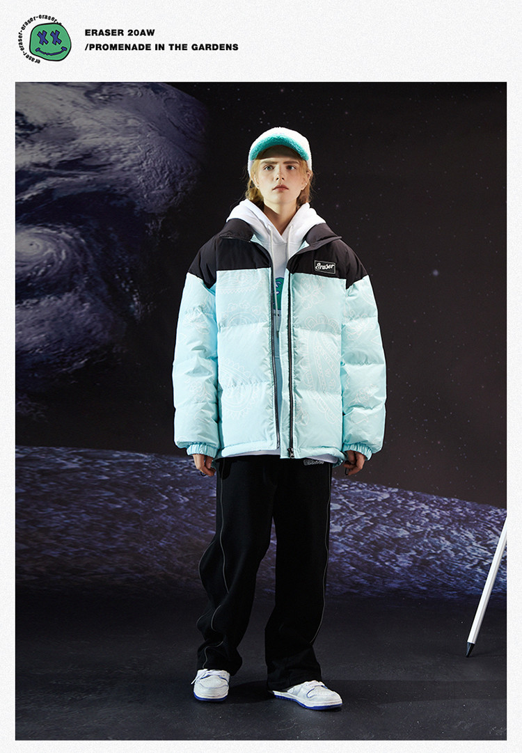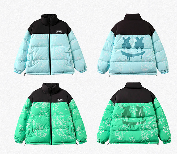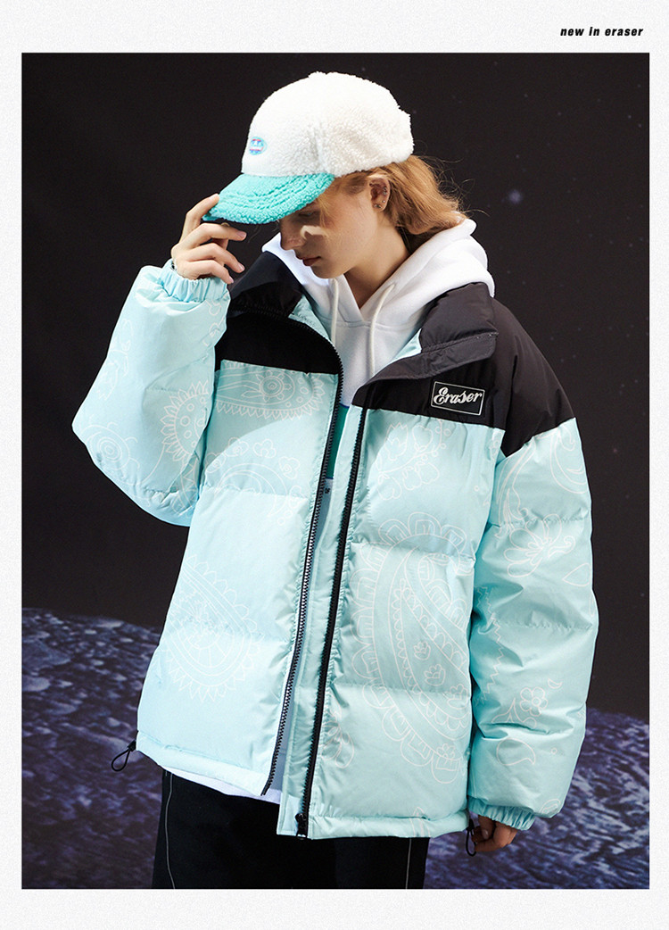 商品名称:腰果花印花立领短款羽绒服男女同款拼接撞色外套国潮牌情侣装 492247