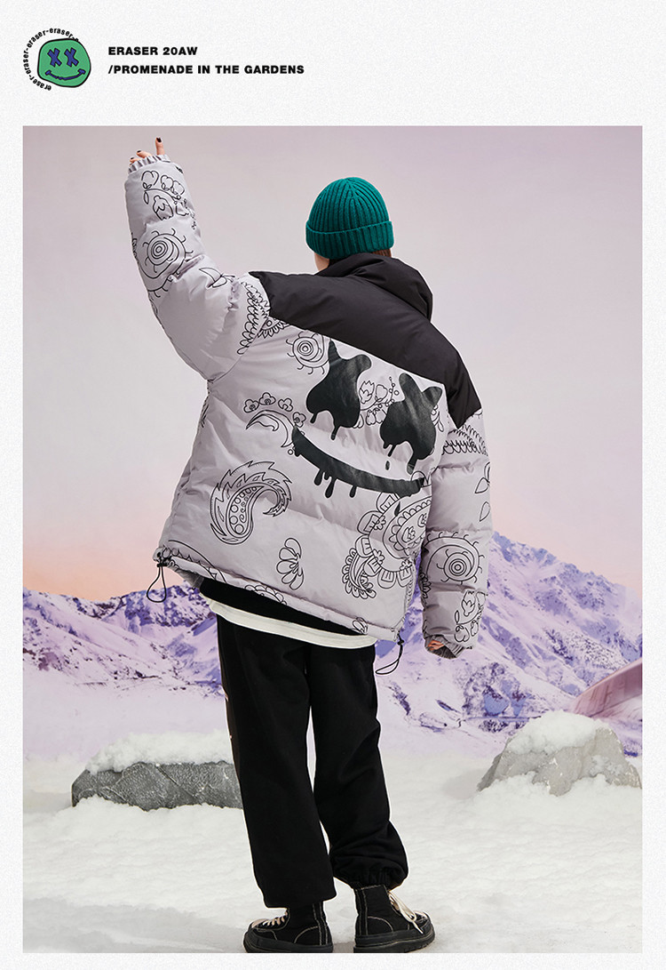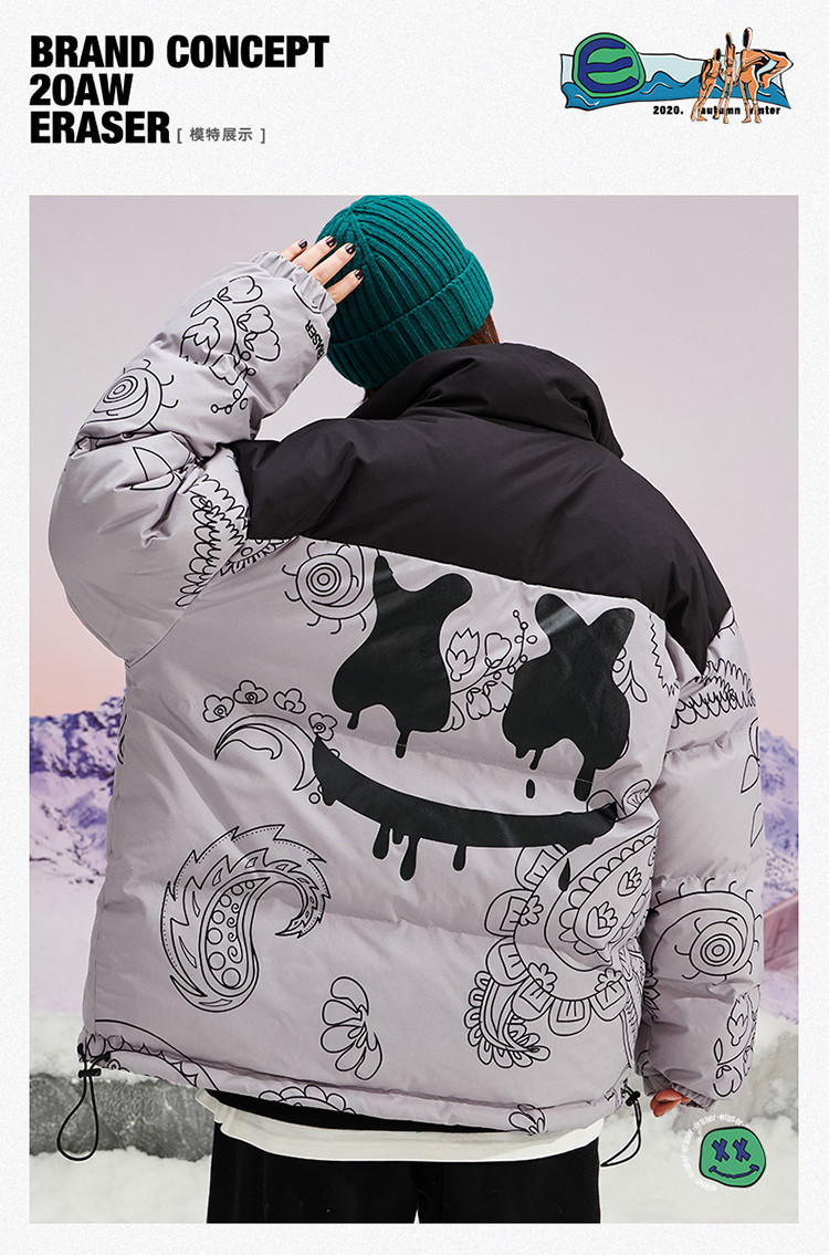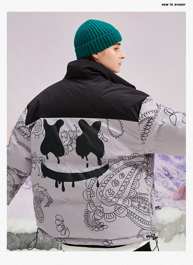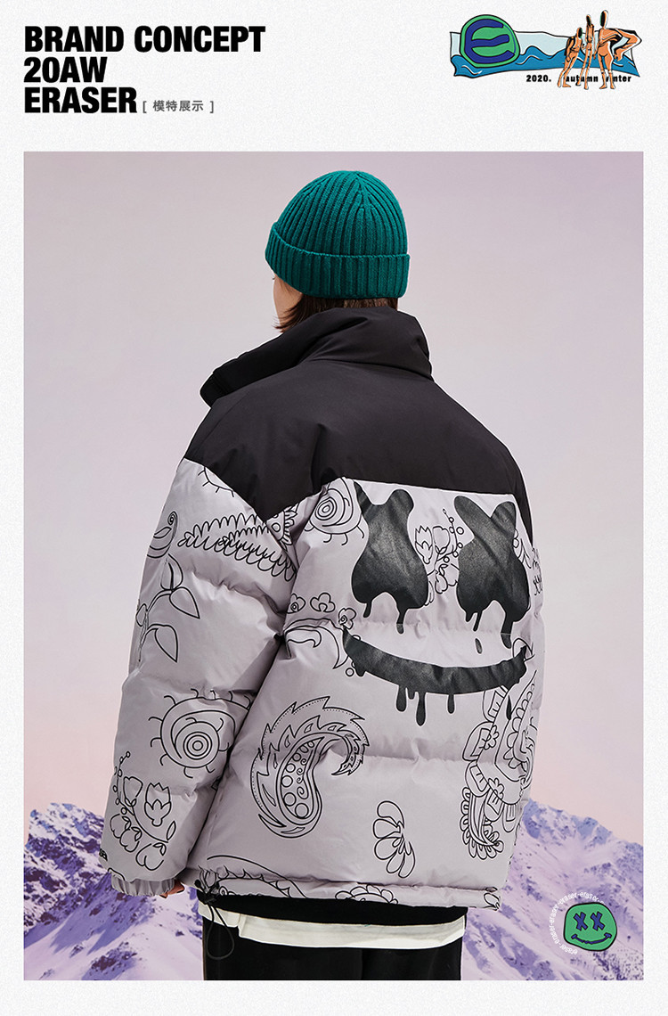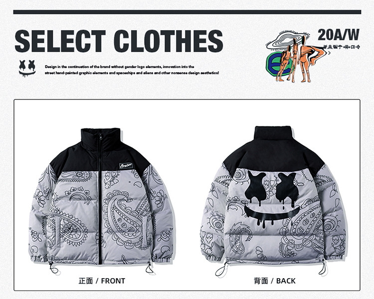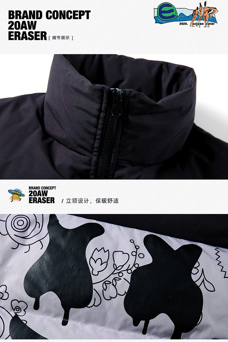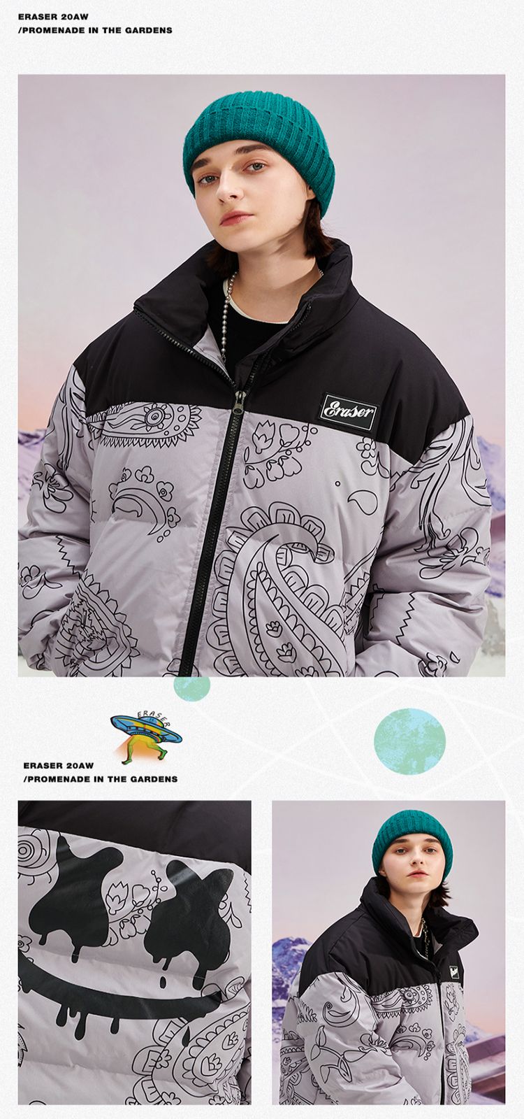 商品名称:腰果花印花立领短款羽绒服男女同款拼接撞色外套国潮牌情侣装 492247