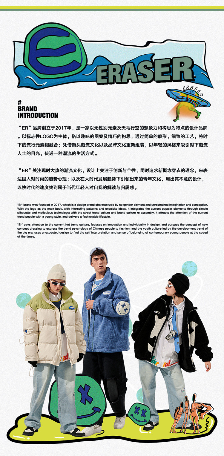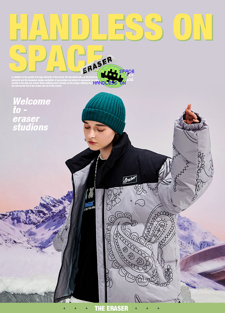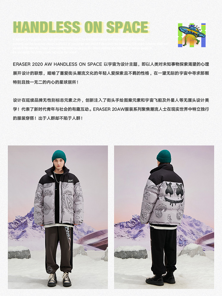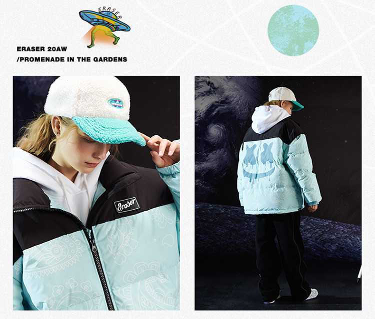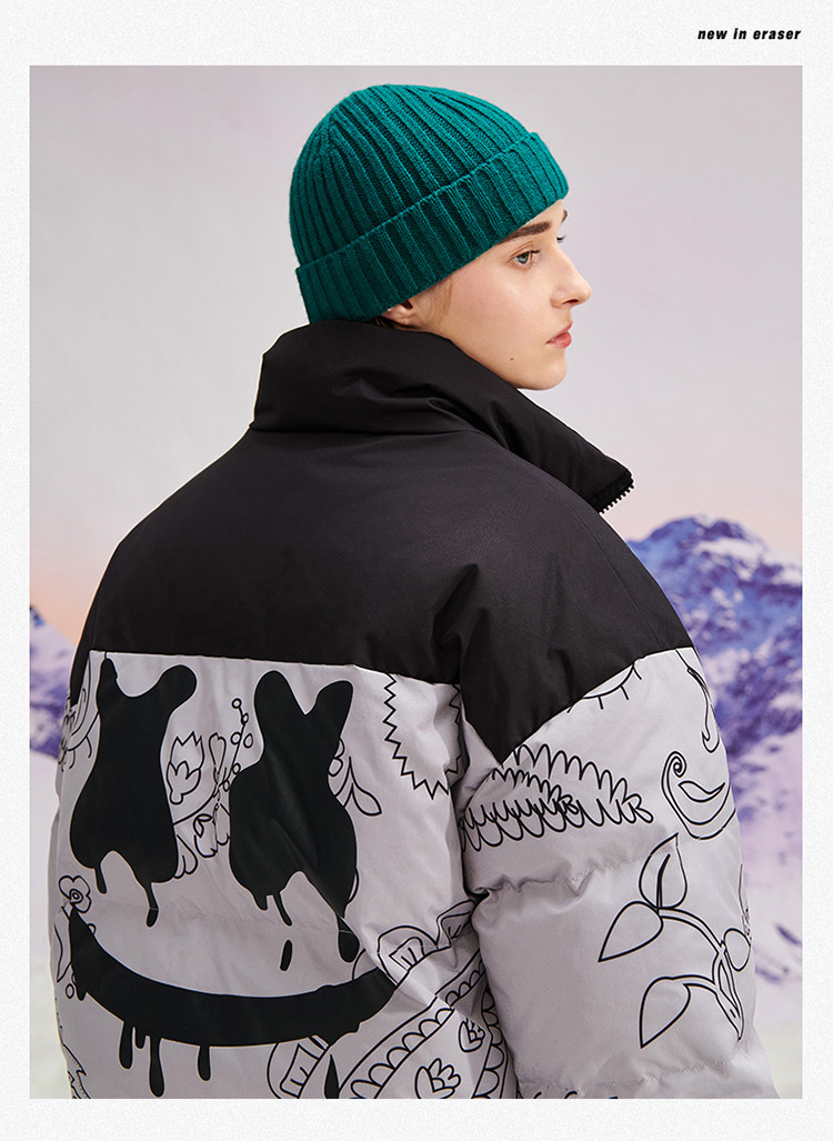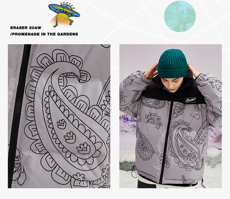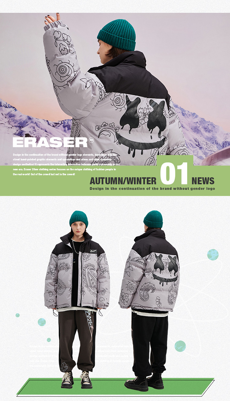商品名称:腰果花印花立领短款羽绒服男女同款拼接撞色外套国潮牌情侣装 492247