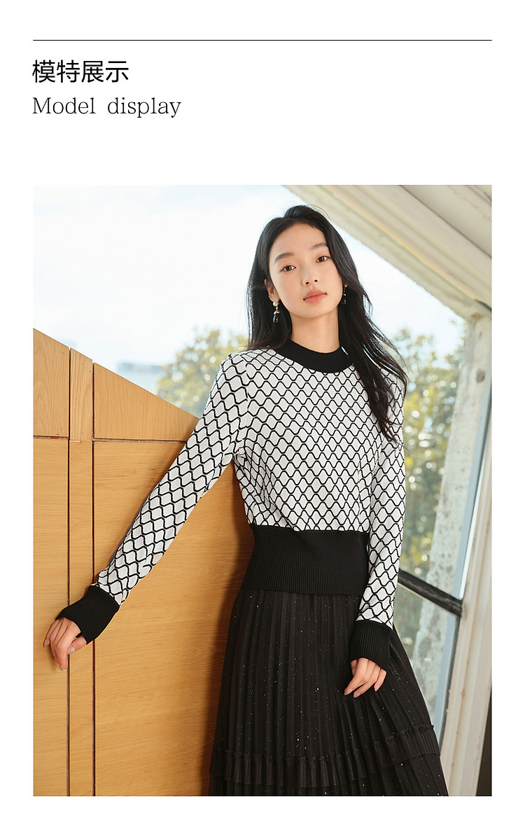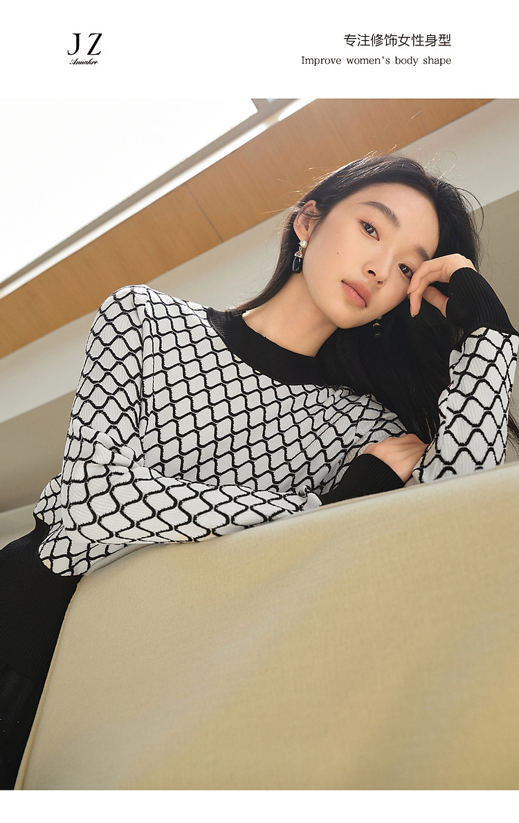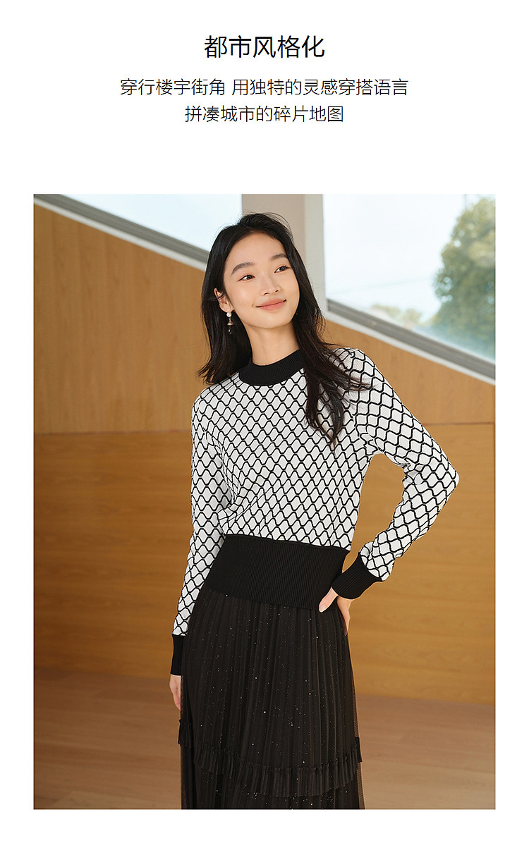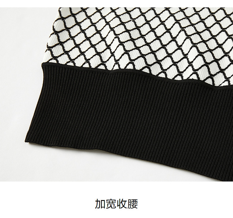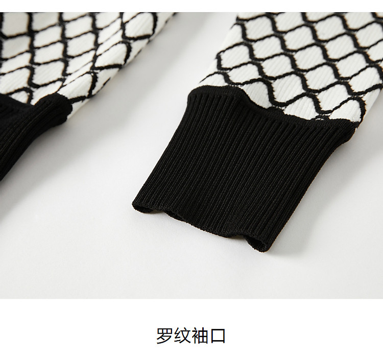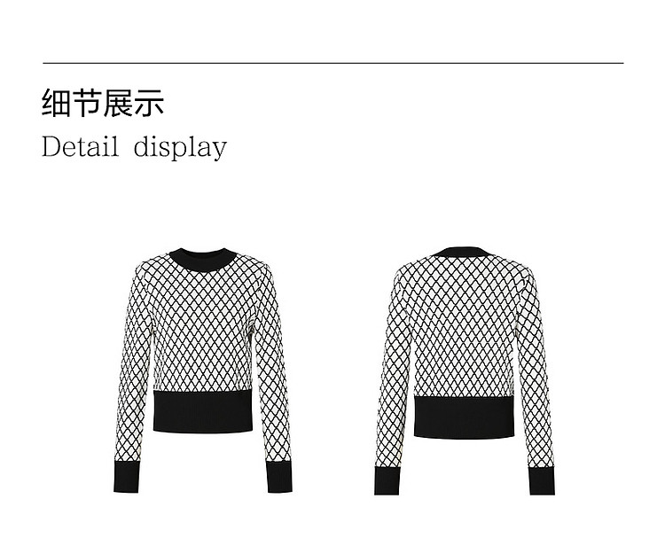 商品名称:玖姿旗下安娜蔻系列时髦菱形格纹曲珠纱X型短款毛衫女春季 060044