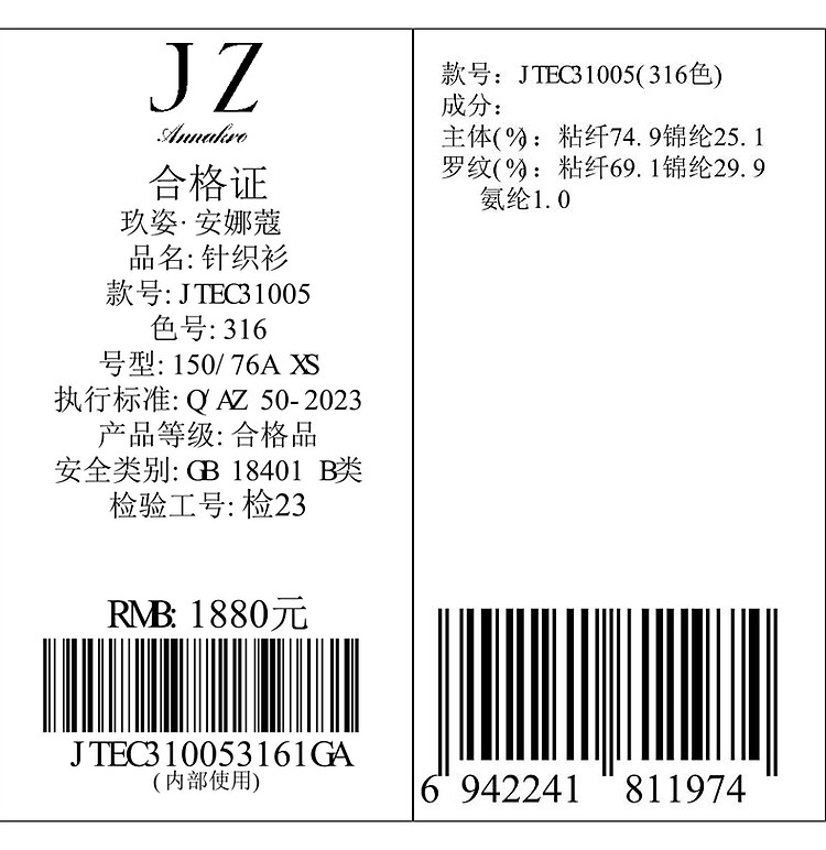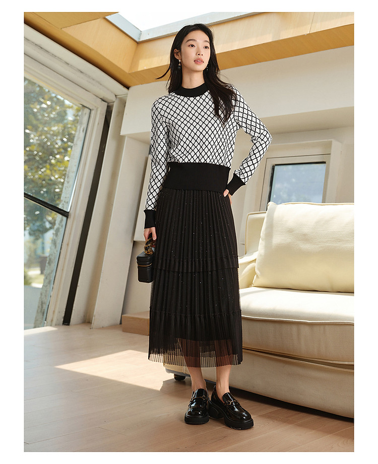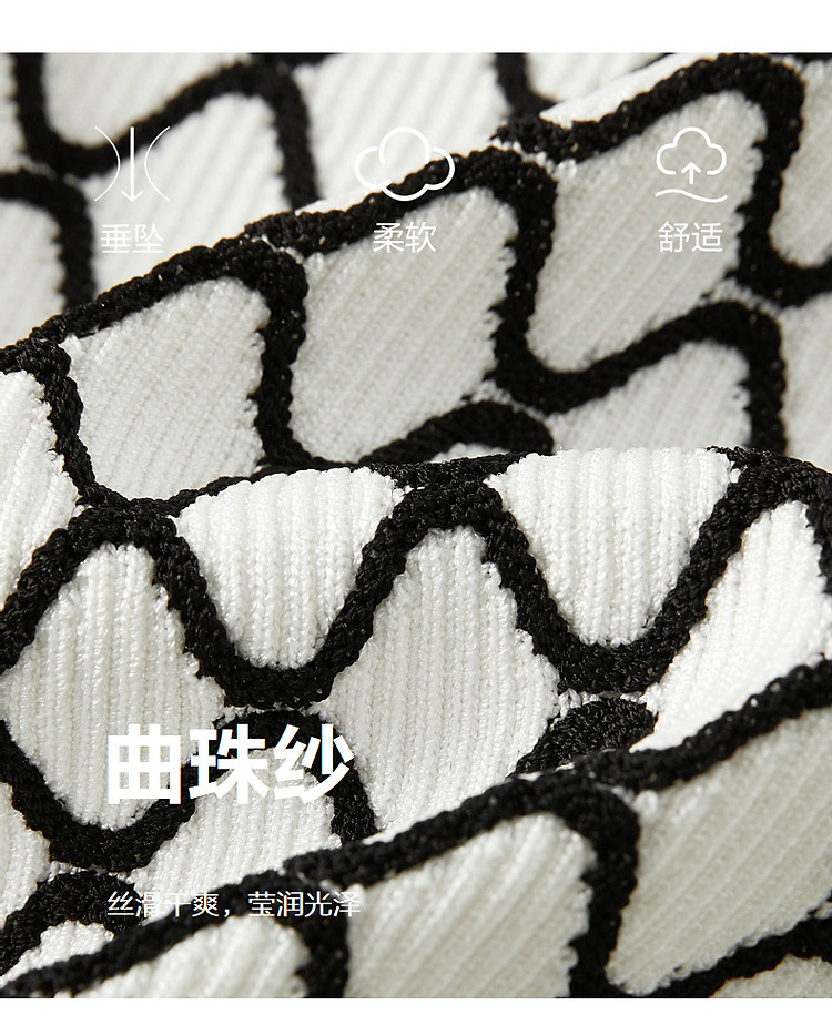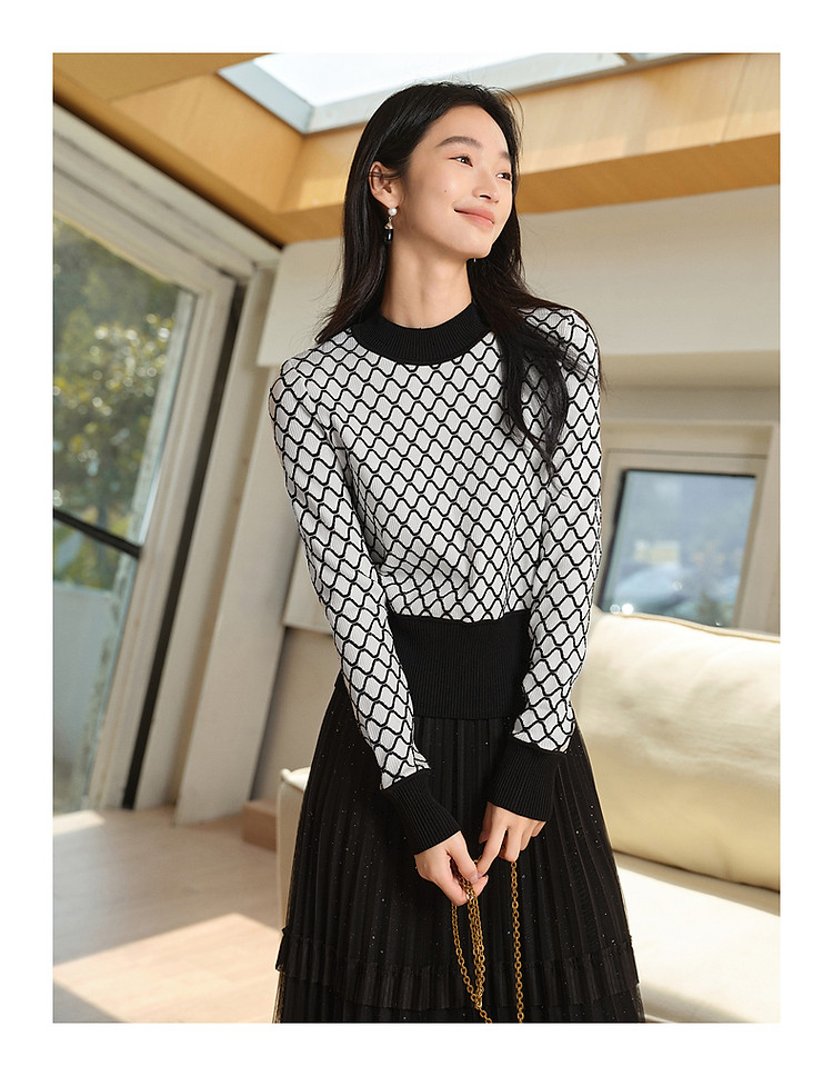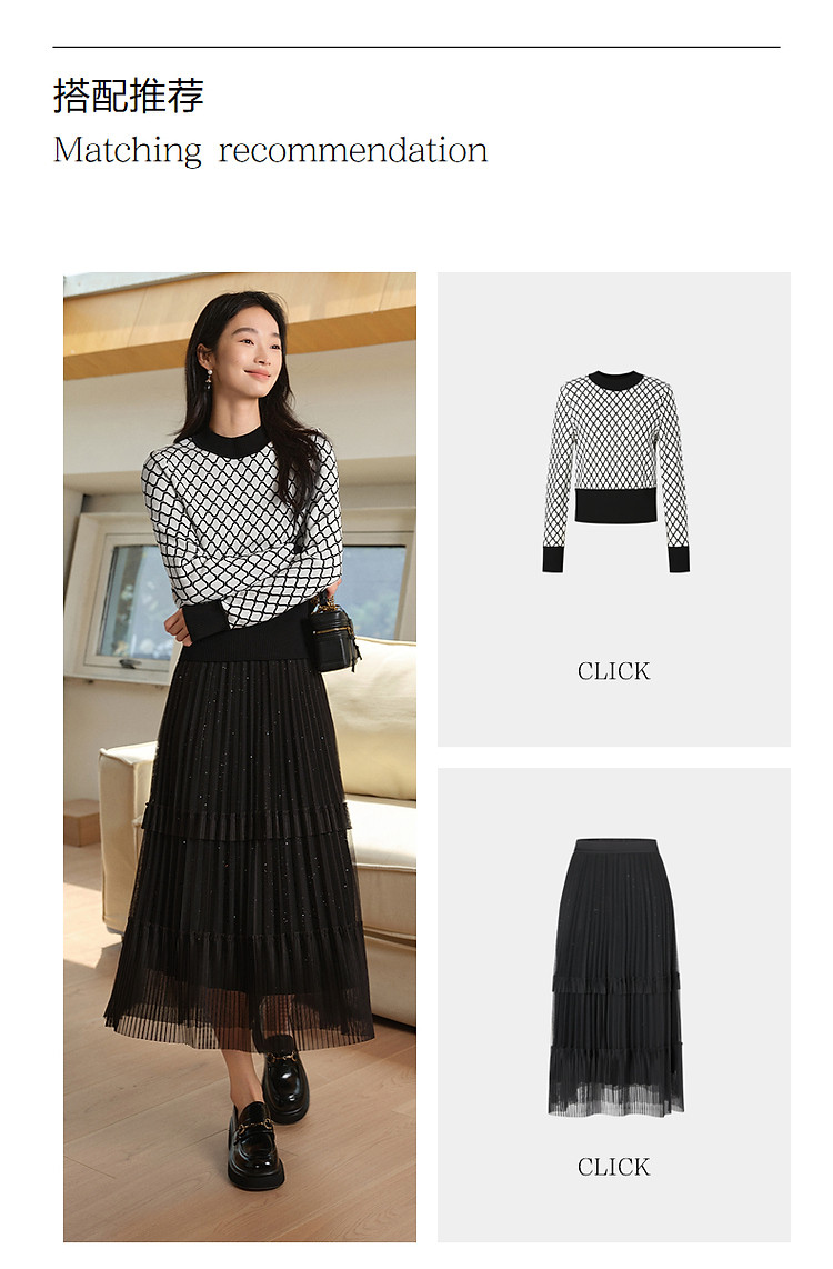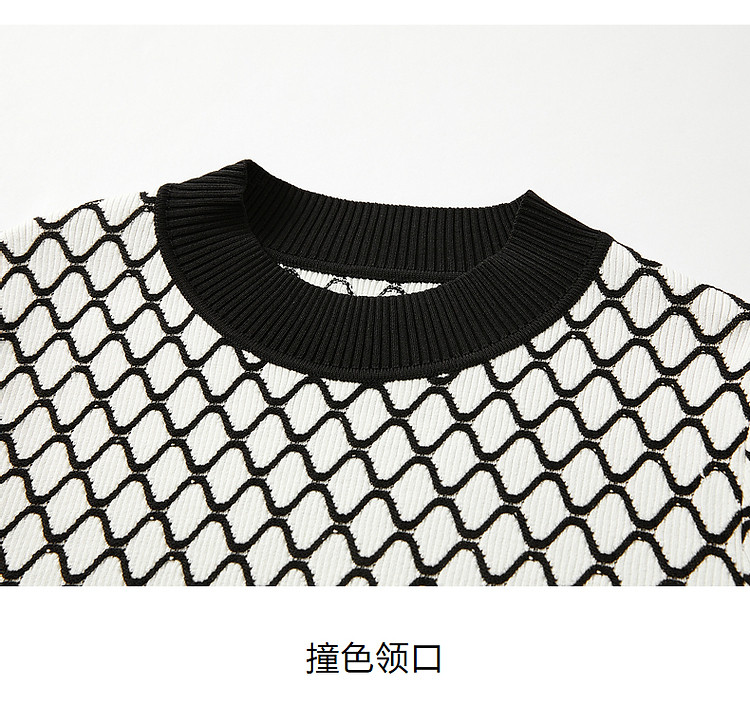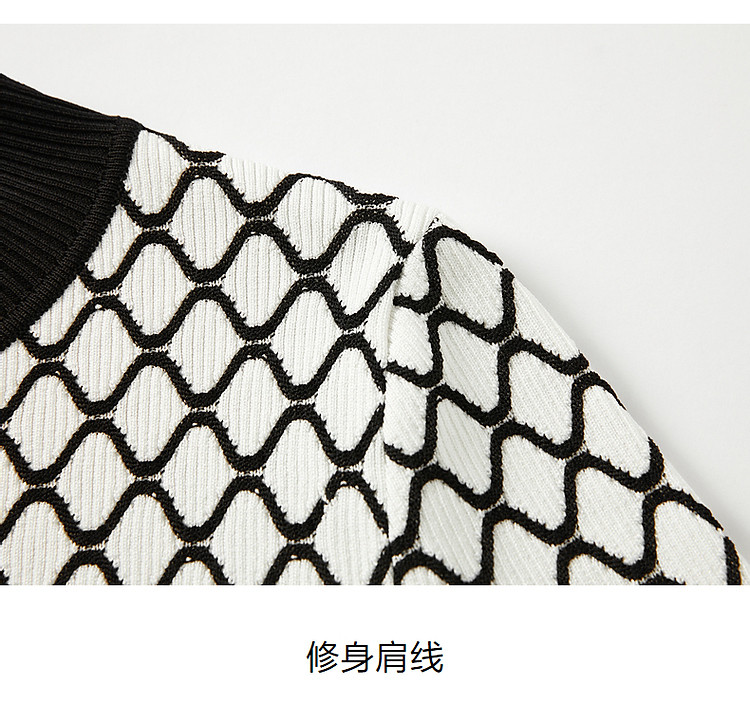 商品名称:玖姿旗下安娜蔻系列时髦菱形格纹曲珠纱X型短款毛衫女春季 060044
