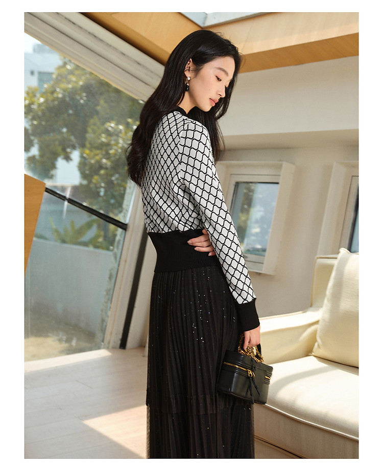 玖姿旗下安娜蔻系列时髦菱形格纹曲珠纱X型短款毛衫女春季 060044