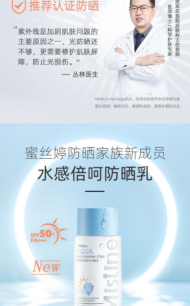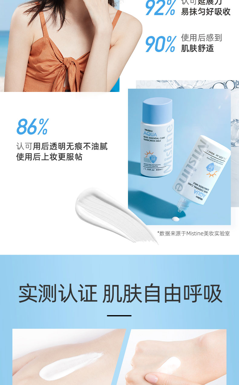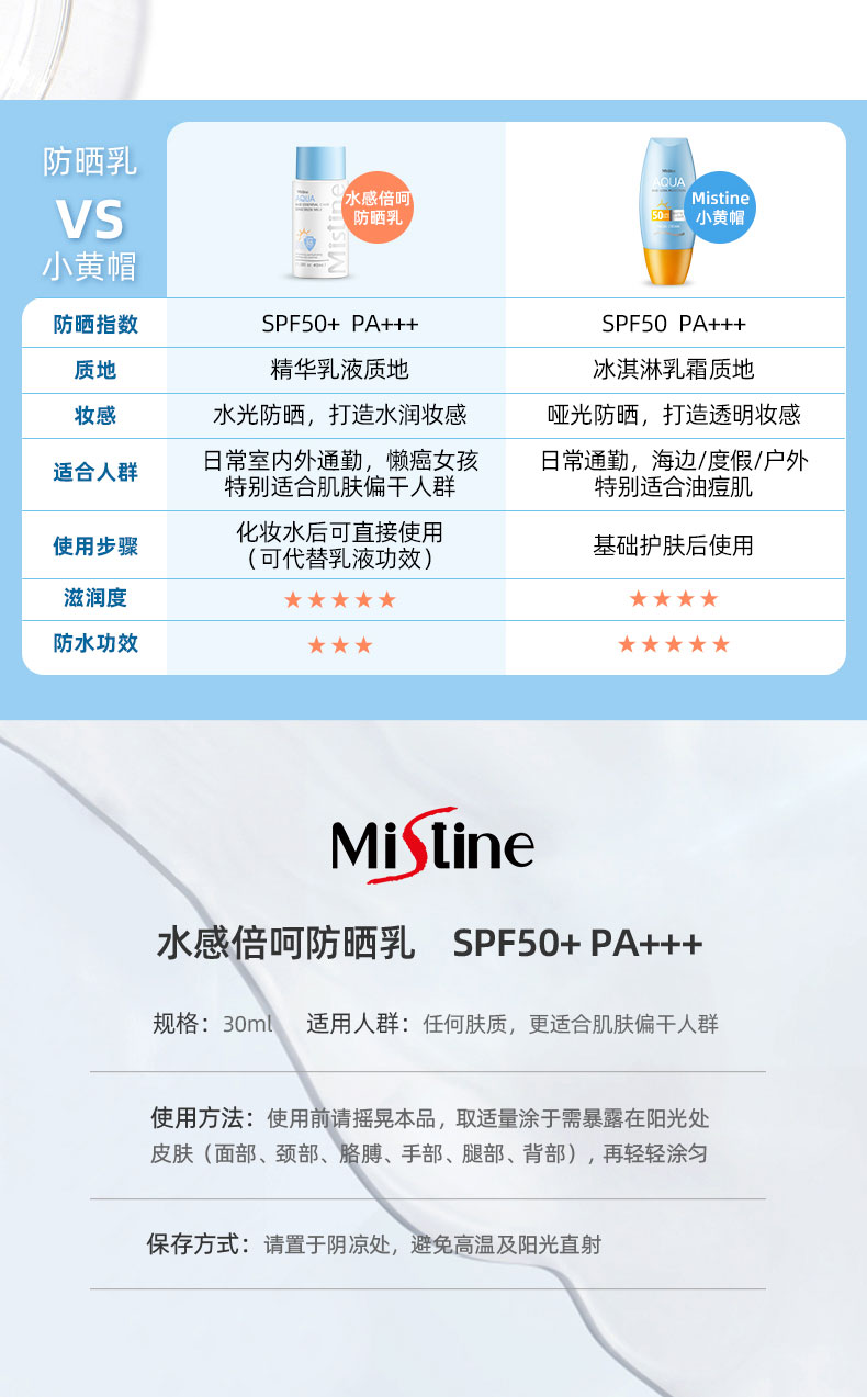商品名称:Mistine/蜜丝婷 小蓝帽精华水感防晒霜乳 40ml 防紫外线隔离三合一