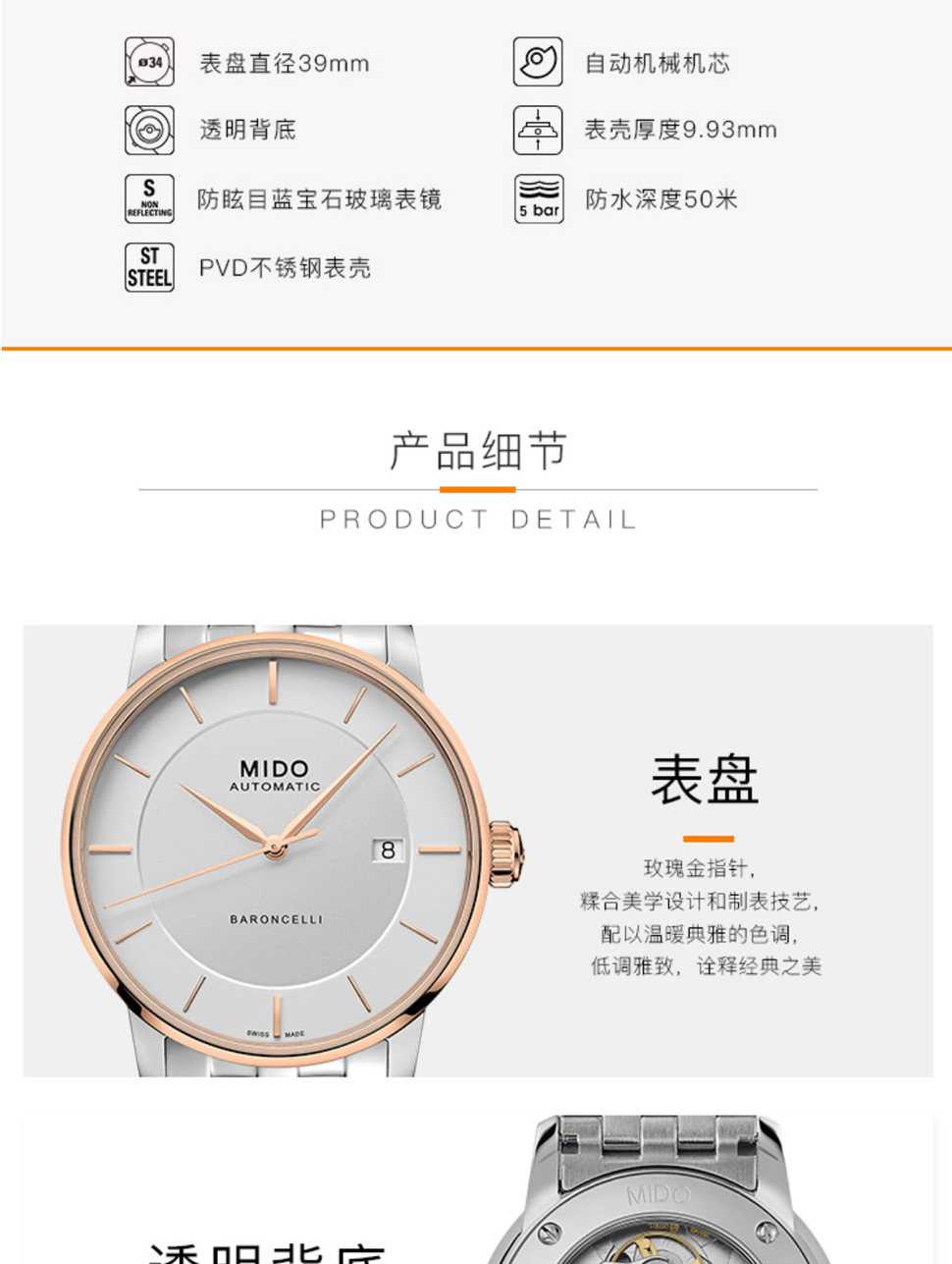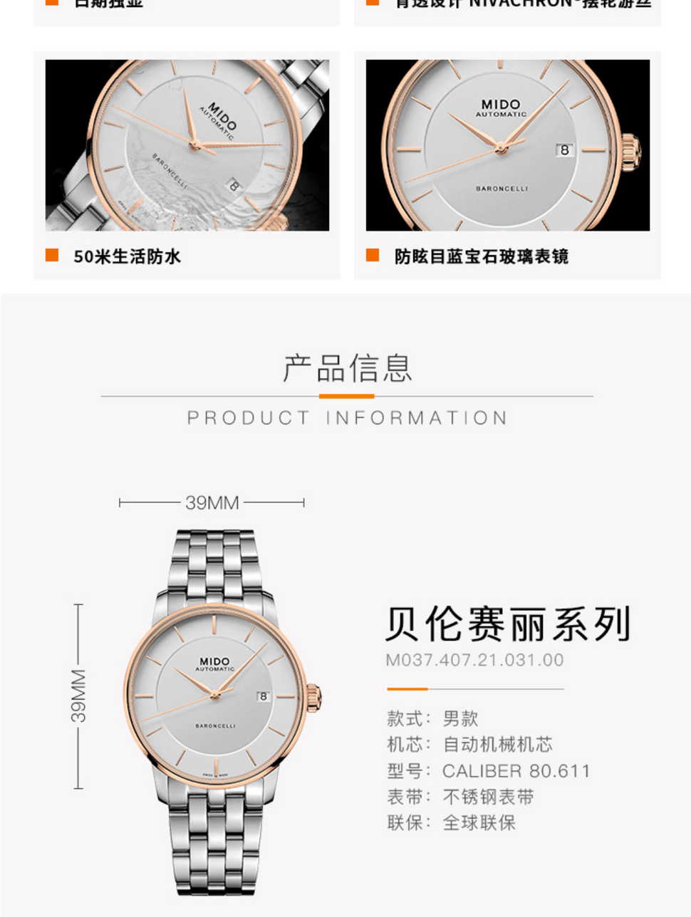 商品名称:MIDO美度 贝伦赛丽系列印记款长动能全自动机械男士腕表 (不支持无理由退换货)