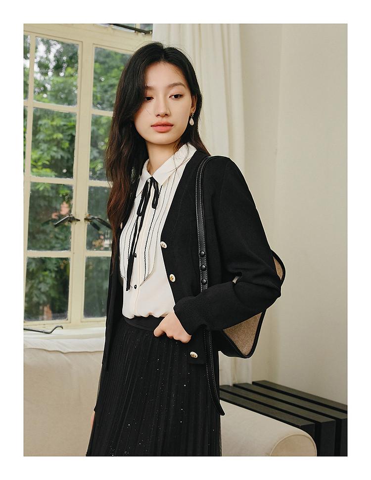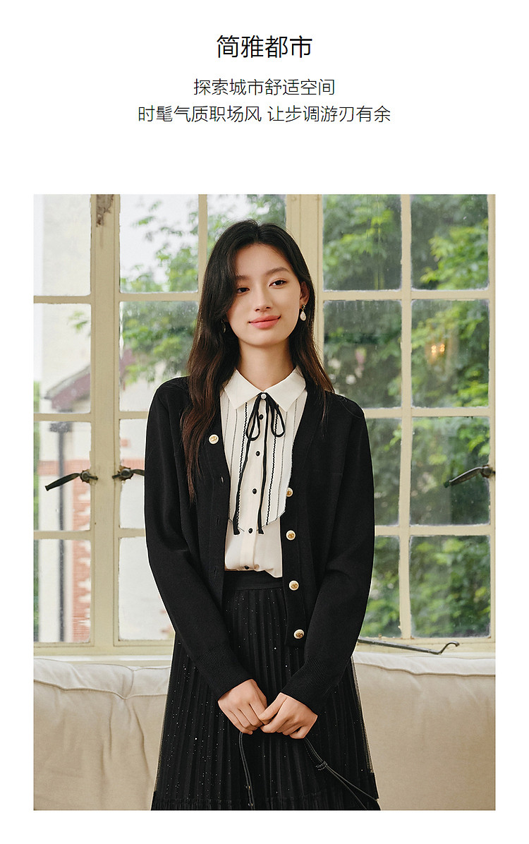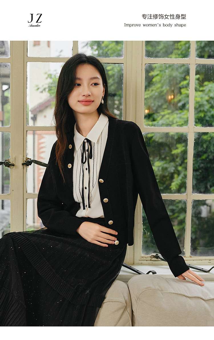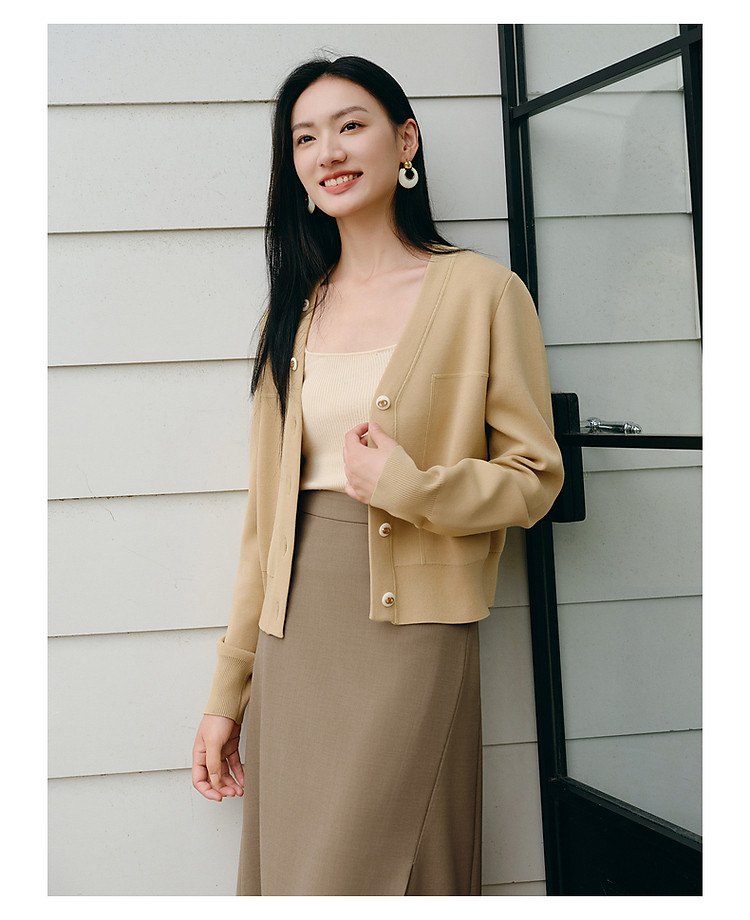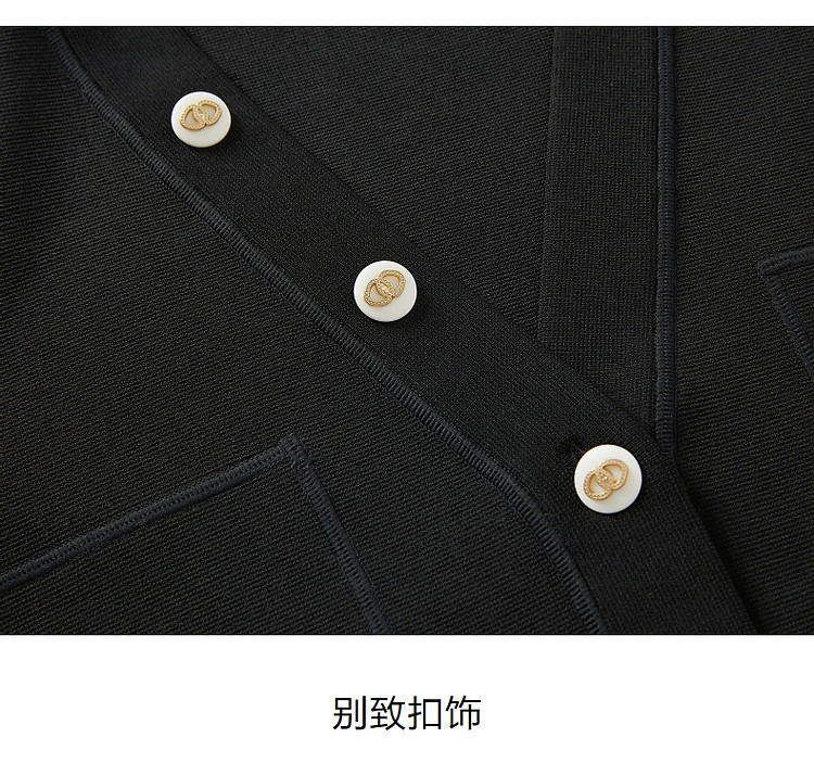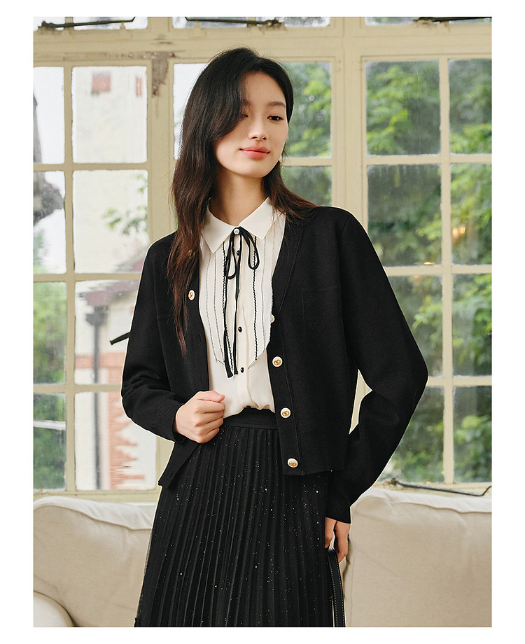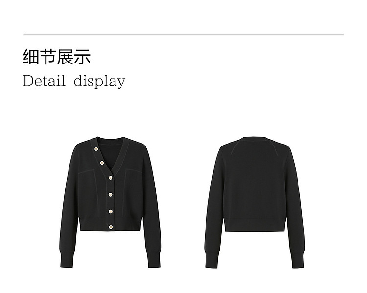 商品名称:玖姿旗下安娜蔻系列简雅宽松落肩纽扣短款开衫毛衫女春季 019084