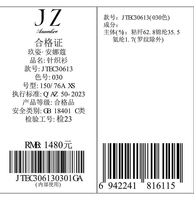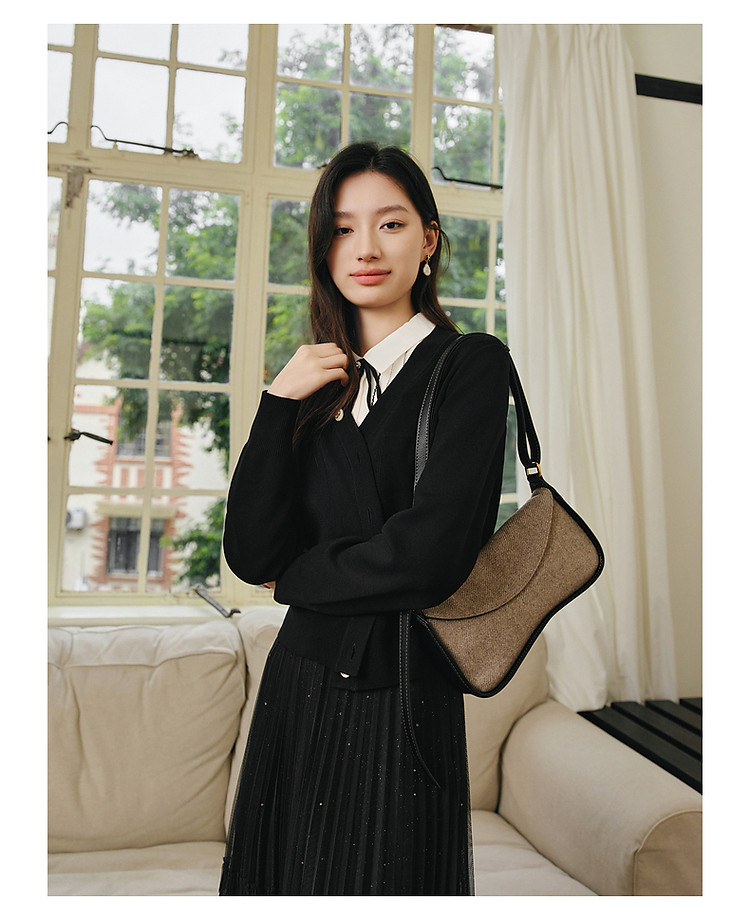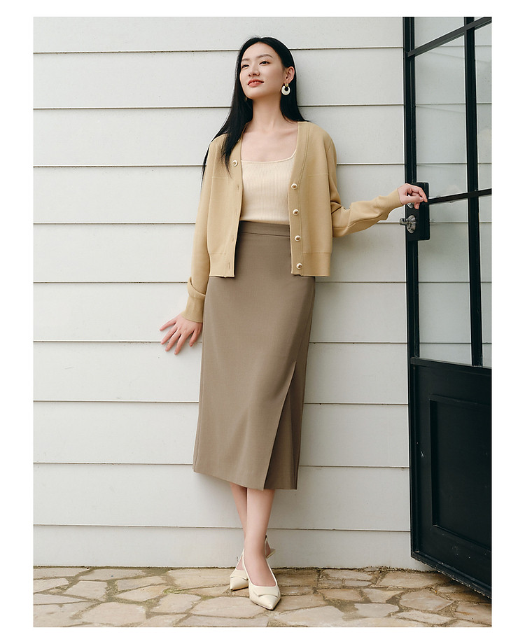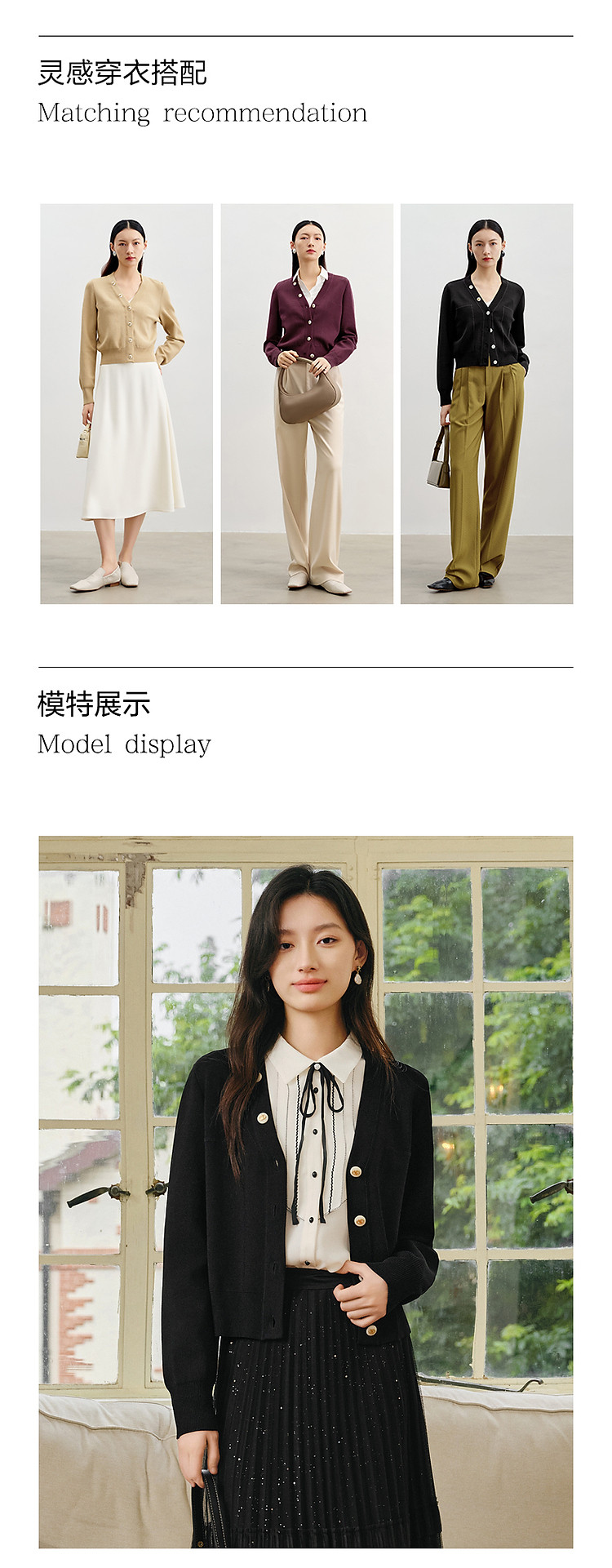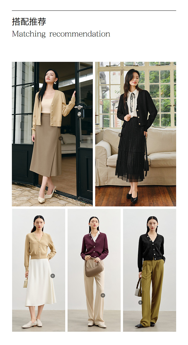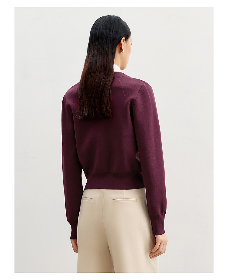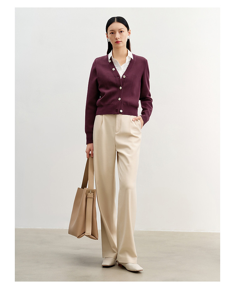 商品名称:玖姿旗下安娜蔻系列简雅宽松落肩纽扣短款开衫毛衫女春季 019084