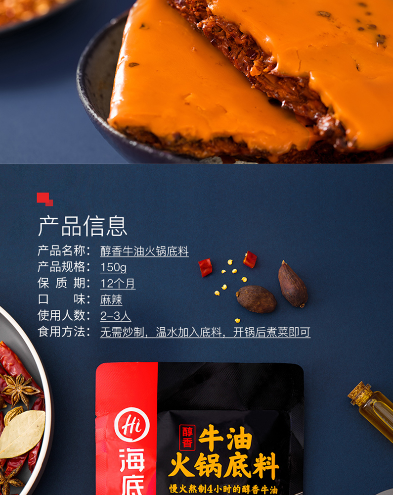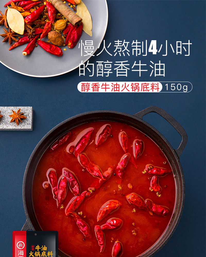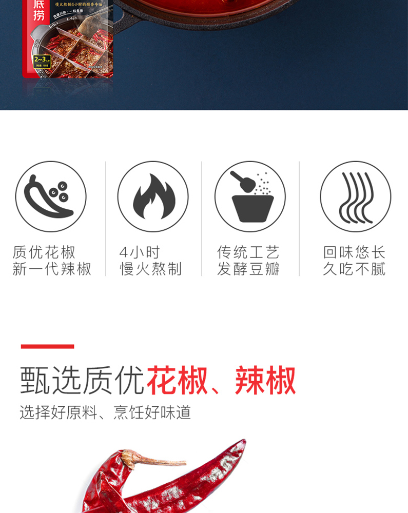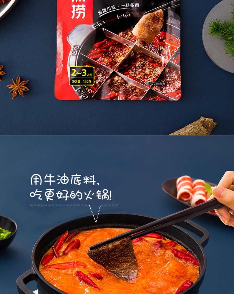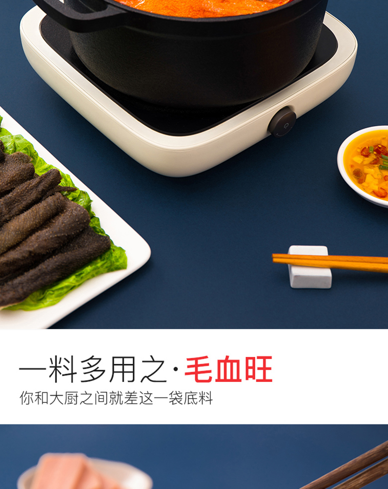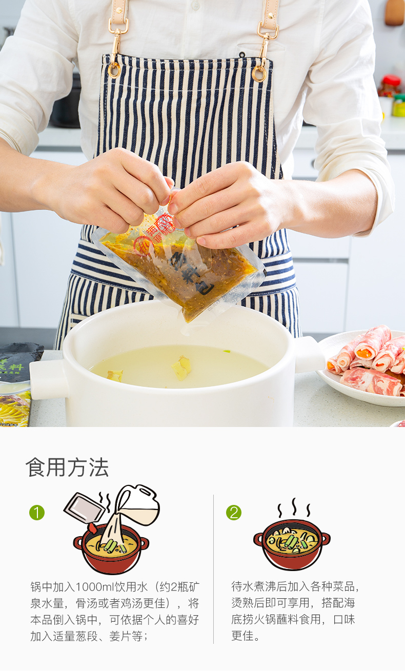 醇香牛油火锅底料150g*3,番茄底料200g*1,清汤底料110g*1,菌汤底料110g*1,香辣味火锅蘸酱120g*1,原味火锅蘸酱120g*1,不锈钢鸳鸯锅1 个