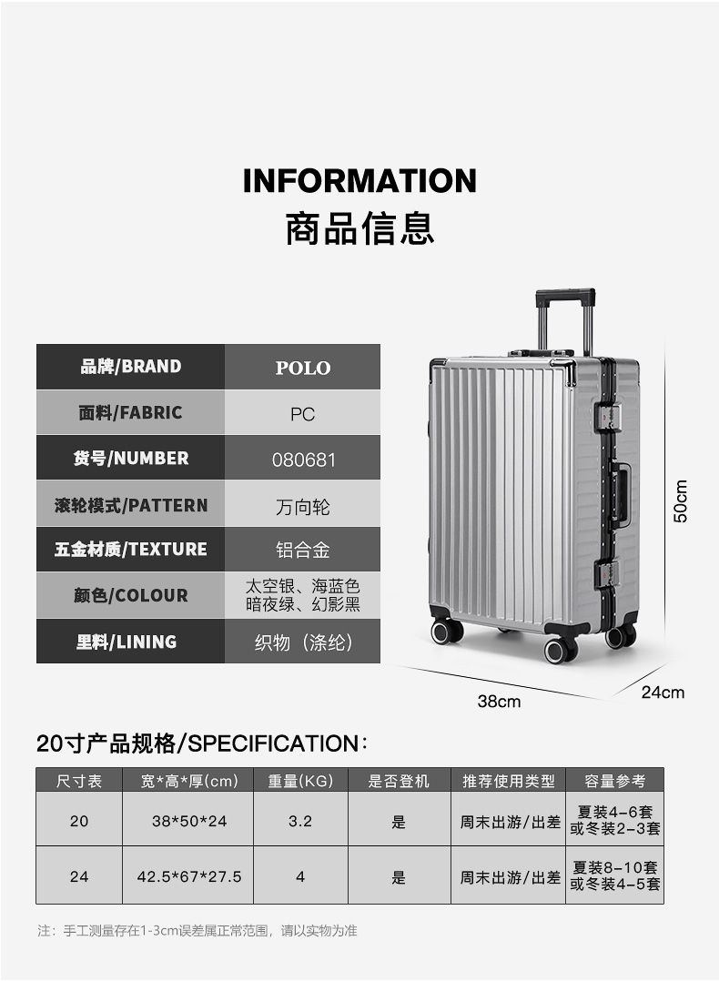 商品名称:POLO拉杆箱轻音飞机轮行李箱登机箱旅行箱男女通用密码箱
